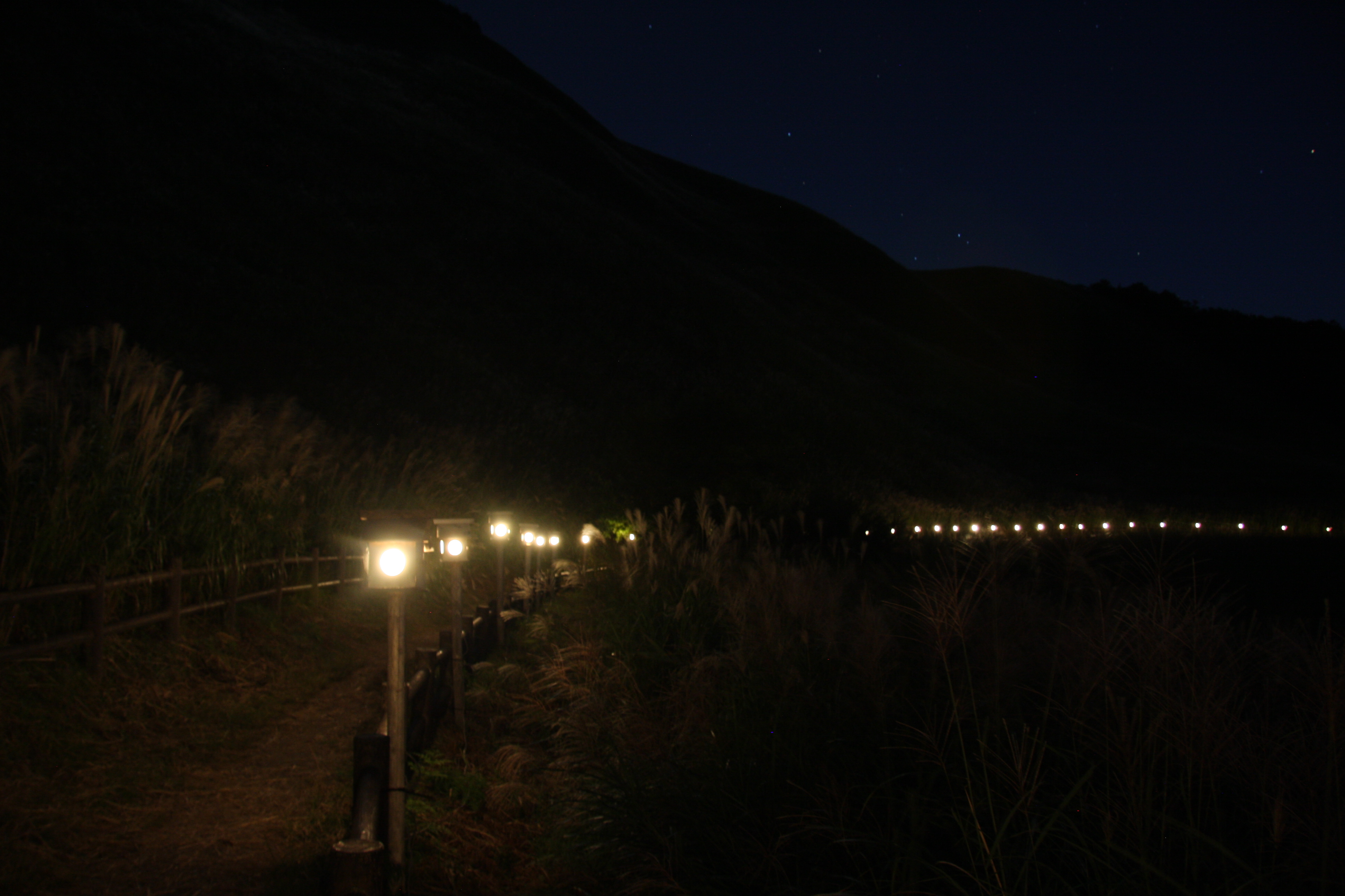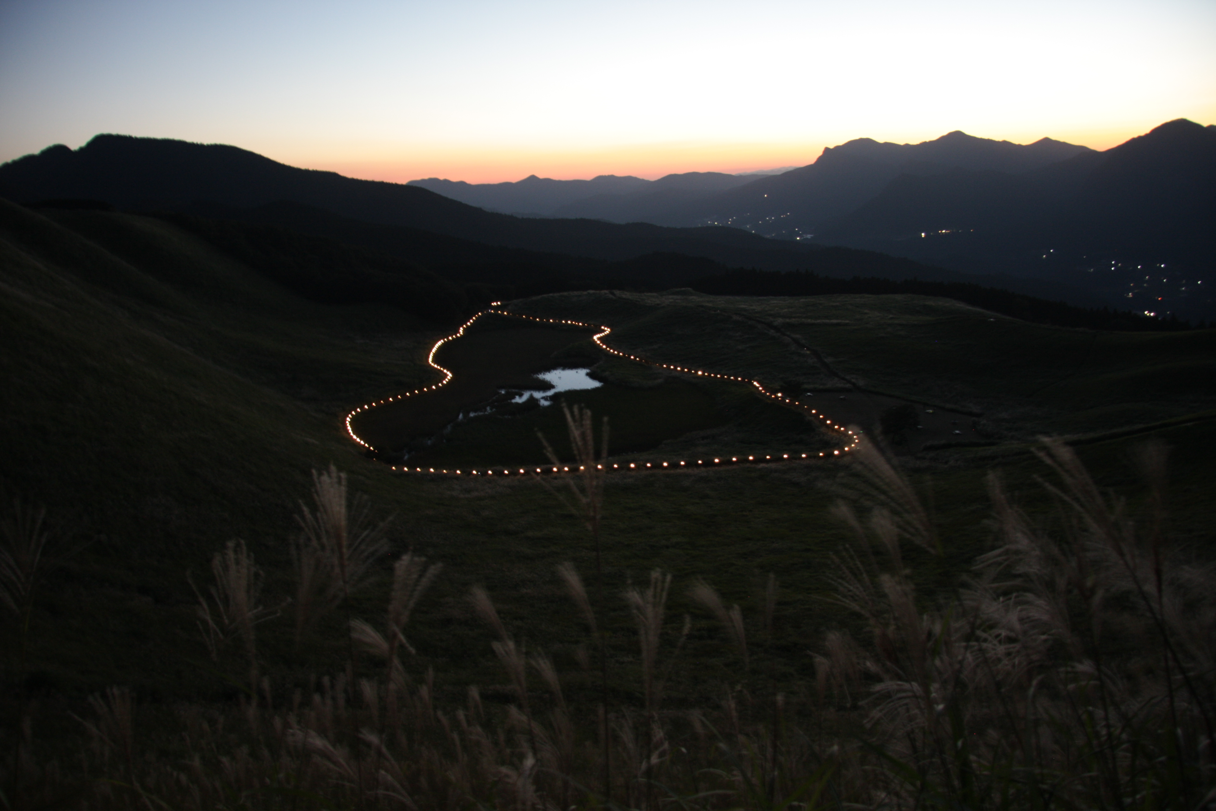さて、曽爾高原はお亀池と言われる池を中心に盆地状の地形をしていますが、日が暮れると急速にあたりが真っ暗になって行くと、お亀池の周りに設置された灯篭に灯がともります。