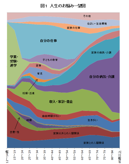 高齢者は健康が目下の悩み事だ。どの年代も人間関係・家族関係については悩んでいる。