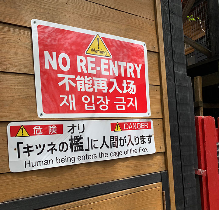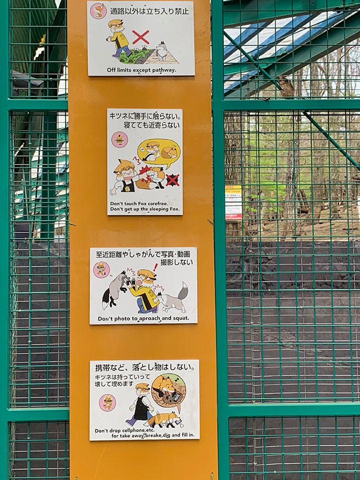 キツネに触れてはいけない、放し飼いエリアの入り口付近で立ち止まらない、などなど。