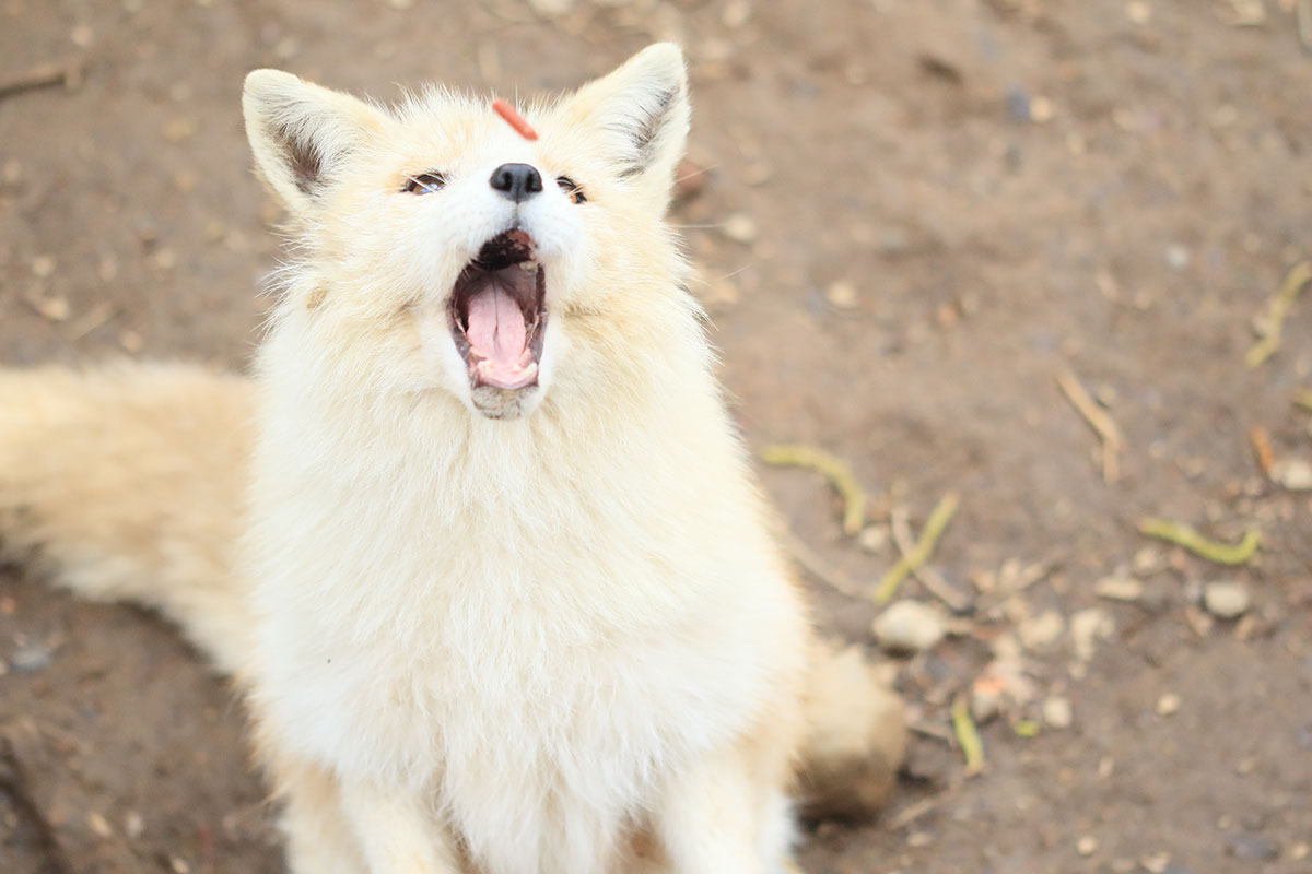 高いところからジャーキーみたいなのを投げてキツネに食べてもらう感じです。