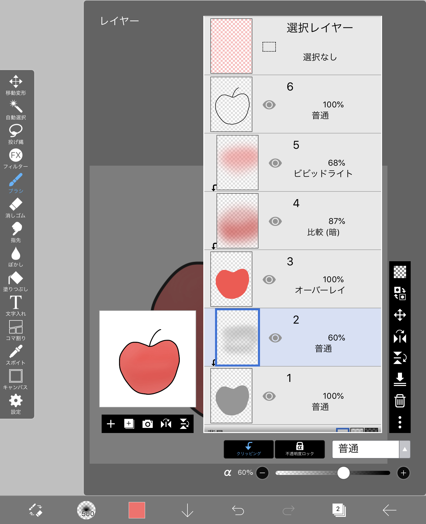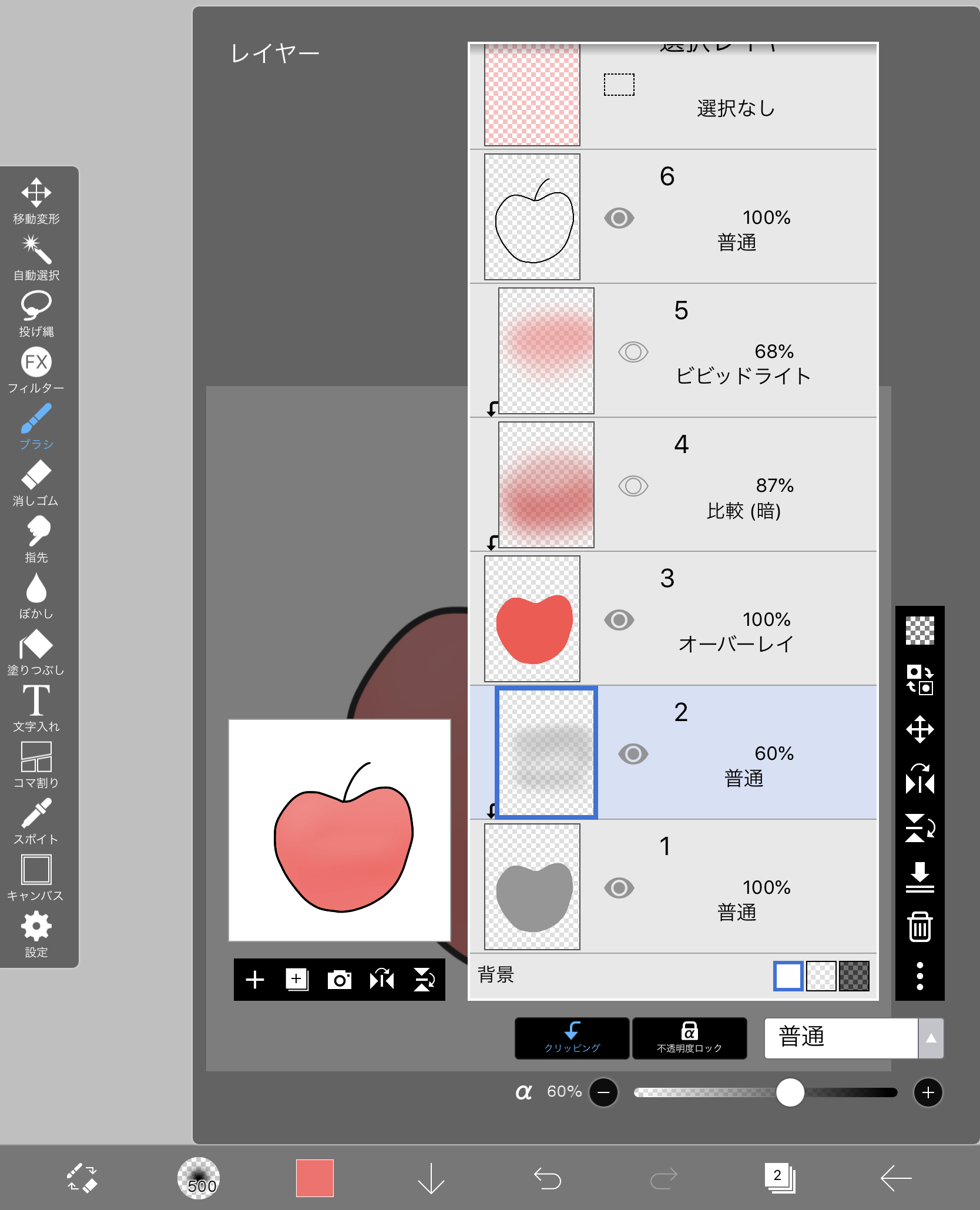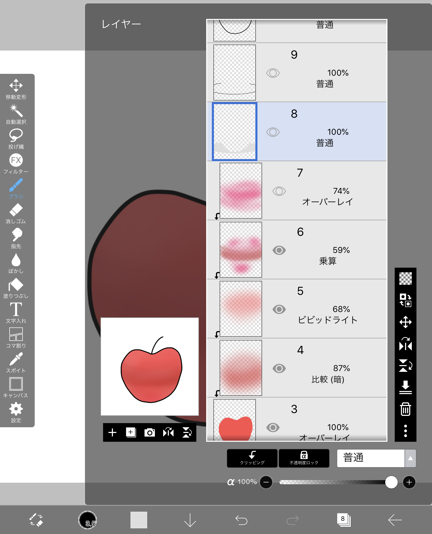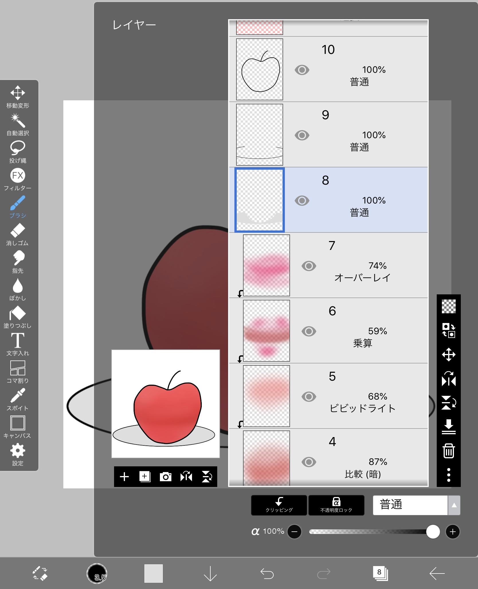 レイヤー6では乗算(59%)でりんごの深みを出しました。
