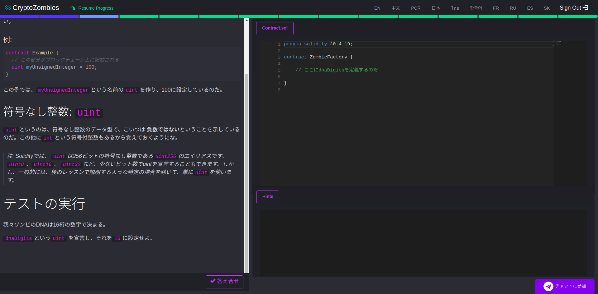 左側にテキストが表示され、右側にはコーディングスペースがあります。それぞれの回でテストが用意されており、実際にコーディングして採点ボタンを押すと採点され、正解だと次の回にすすめるようになっています。どうしてもわからないときは答えを見ることもできますのでご安心を。