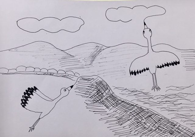 思いつくままに、鶴みたいな鳥がくちばしの先にインクをつけて、大きな川の風景を描いているところを絵に描いた。