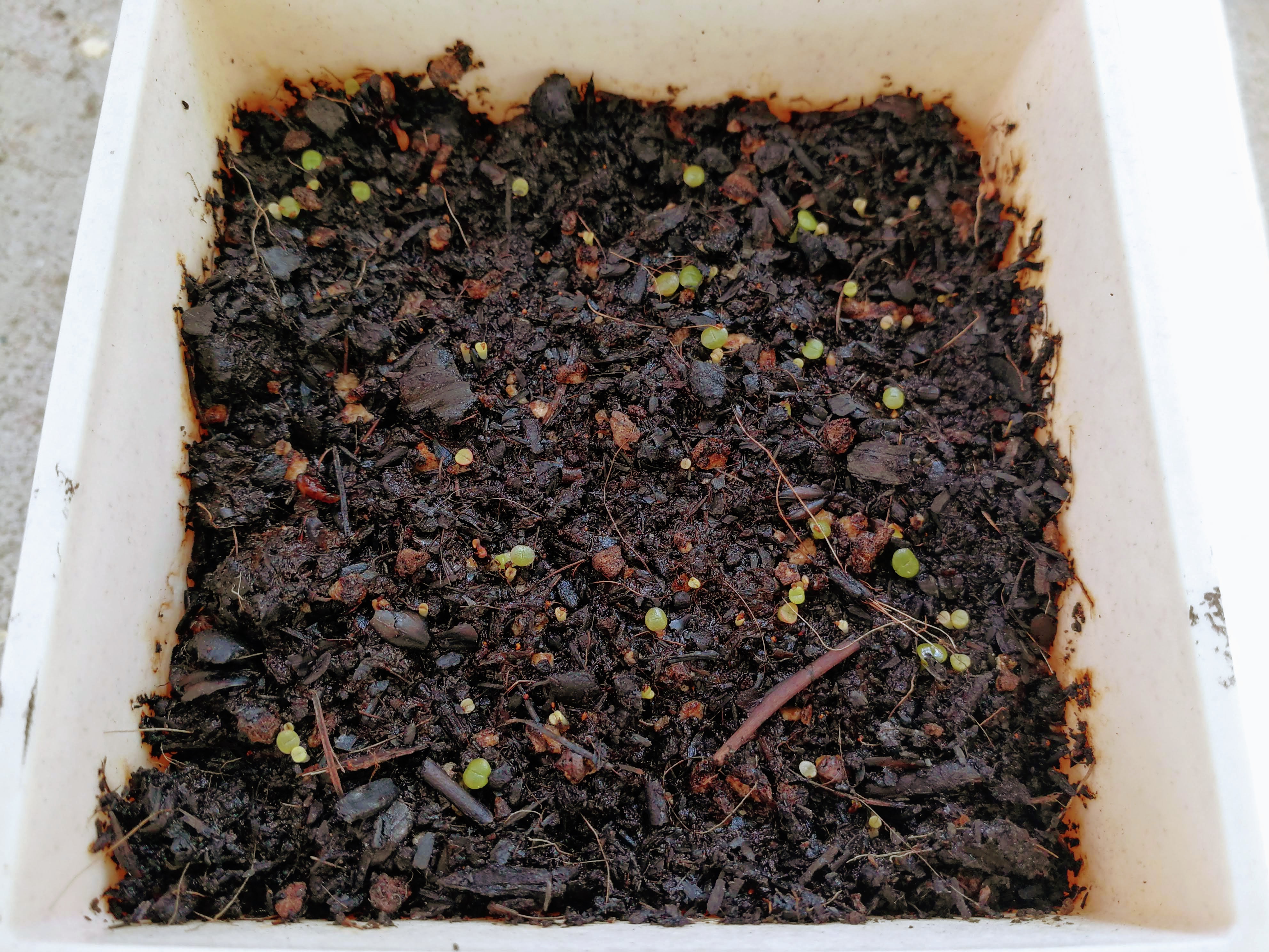 今年の10月9日。種を蒔いてから1週間しないうちに発芽しました。緑色のつぶつぶがそれです。