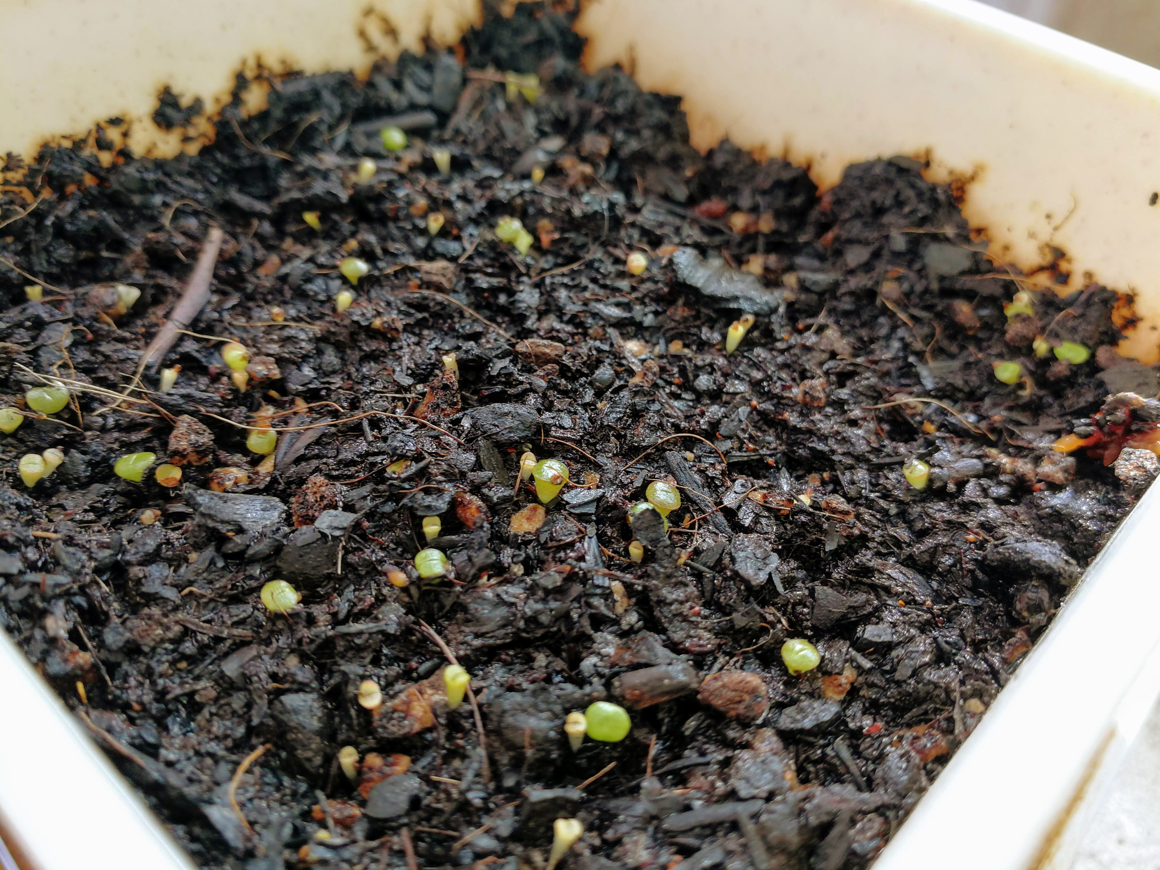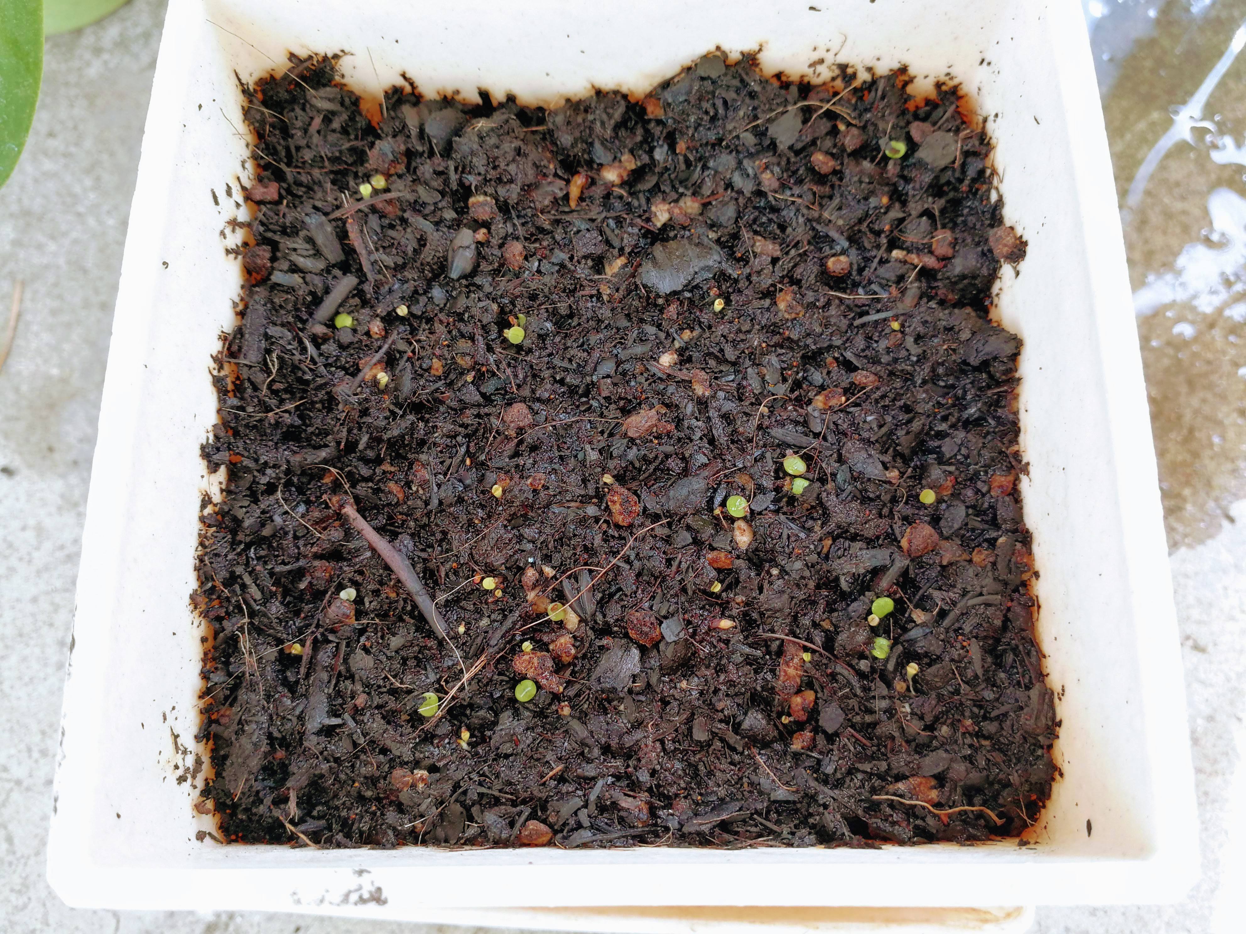 発芽のさせ方自体は簡単で、一般的な種まき用の土(100円ショップで買ってきた)にぱらぱらと撒くだけ。気持ち、薄っすらと土を被せました。重要な点は、腰水管理にして常に土を湿らせておくことです。日陰で管理。数日後、芽が出てくるはずです。
