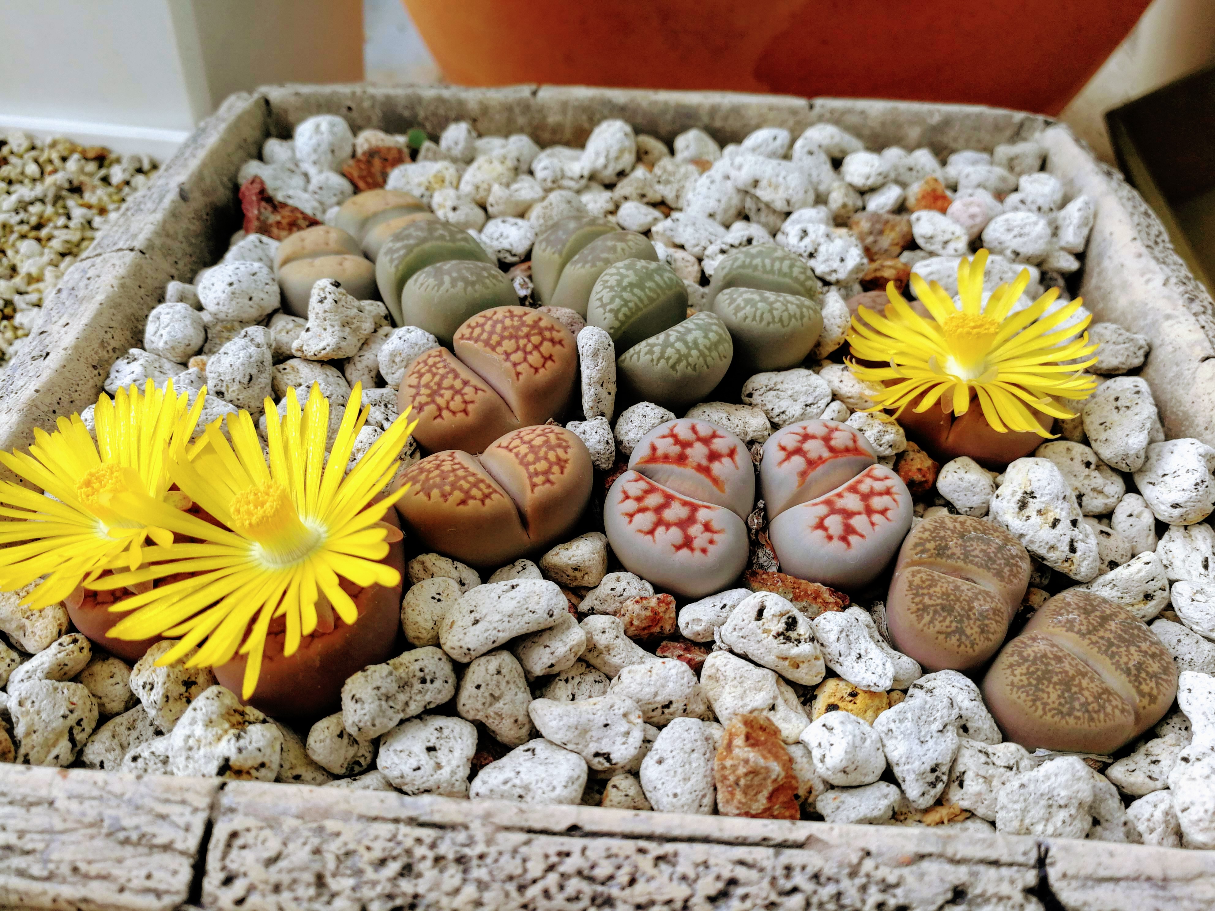 リトープスはアフリカ原産の植物で、乾燥地帯で石に擬態して生き延びている植物です。その珍奇さ、美しさ、色や模様の多様さから「生きる宝石」とも呼ばれています。