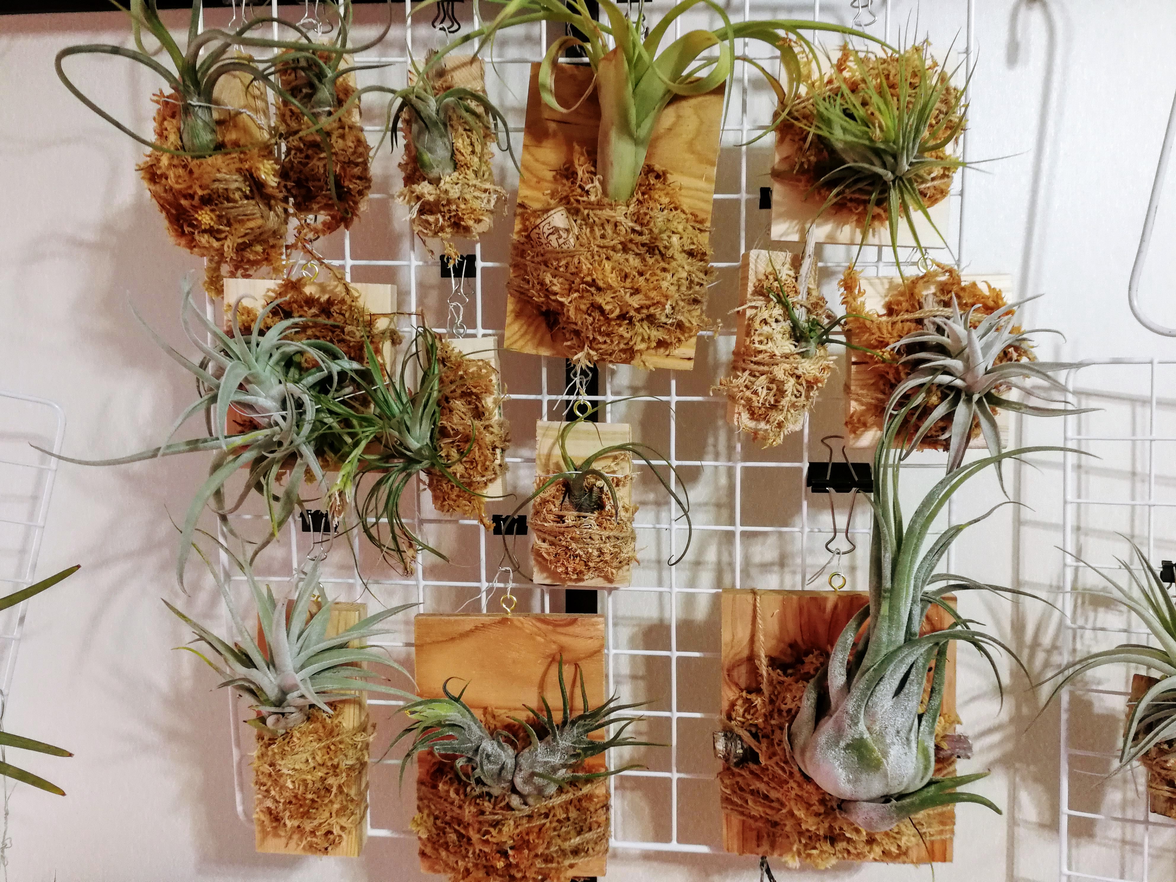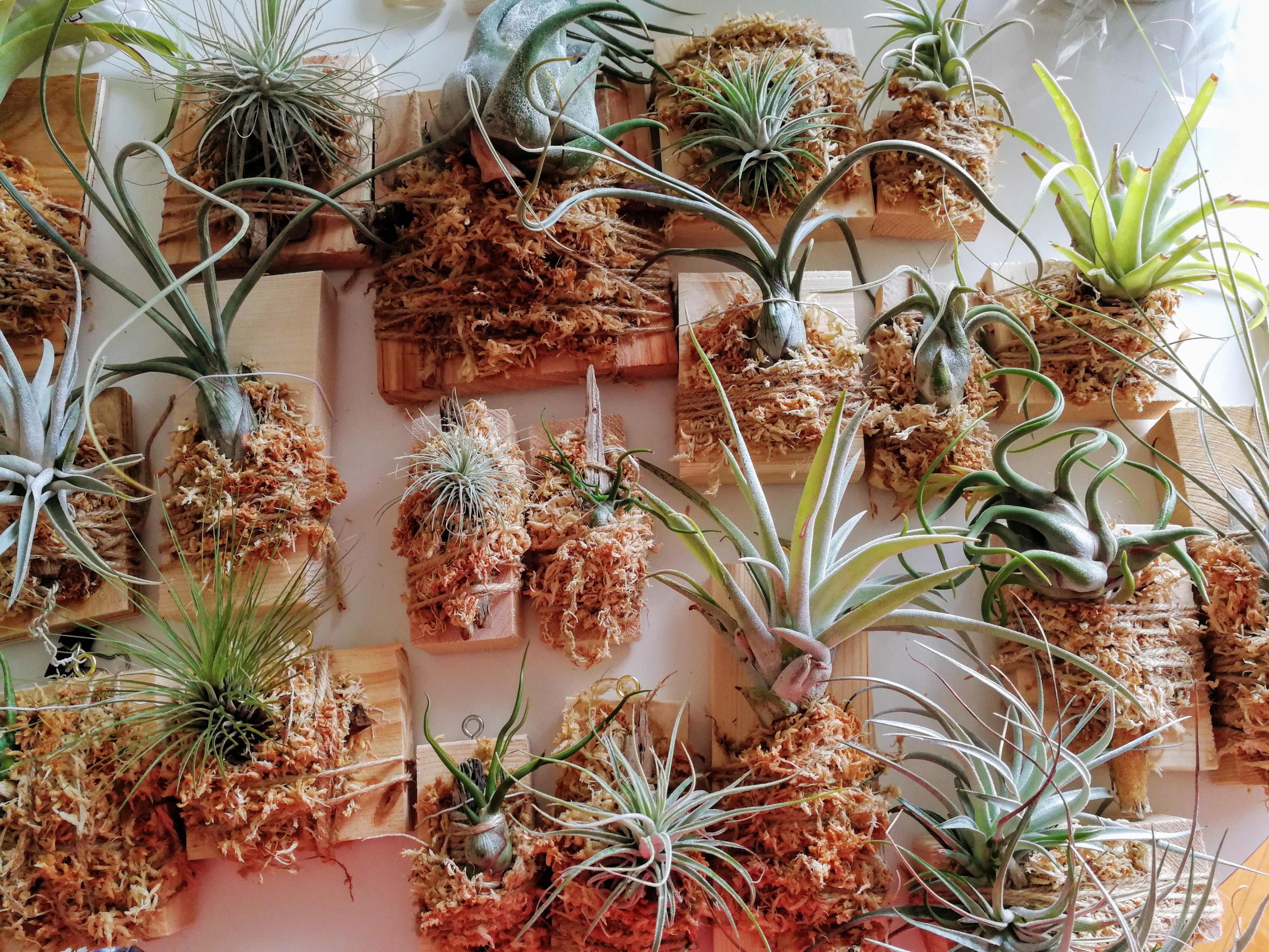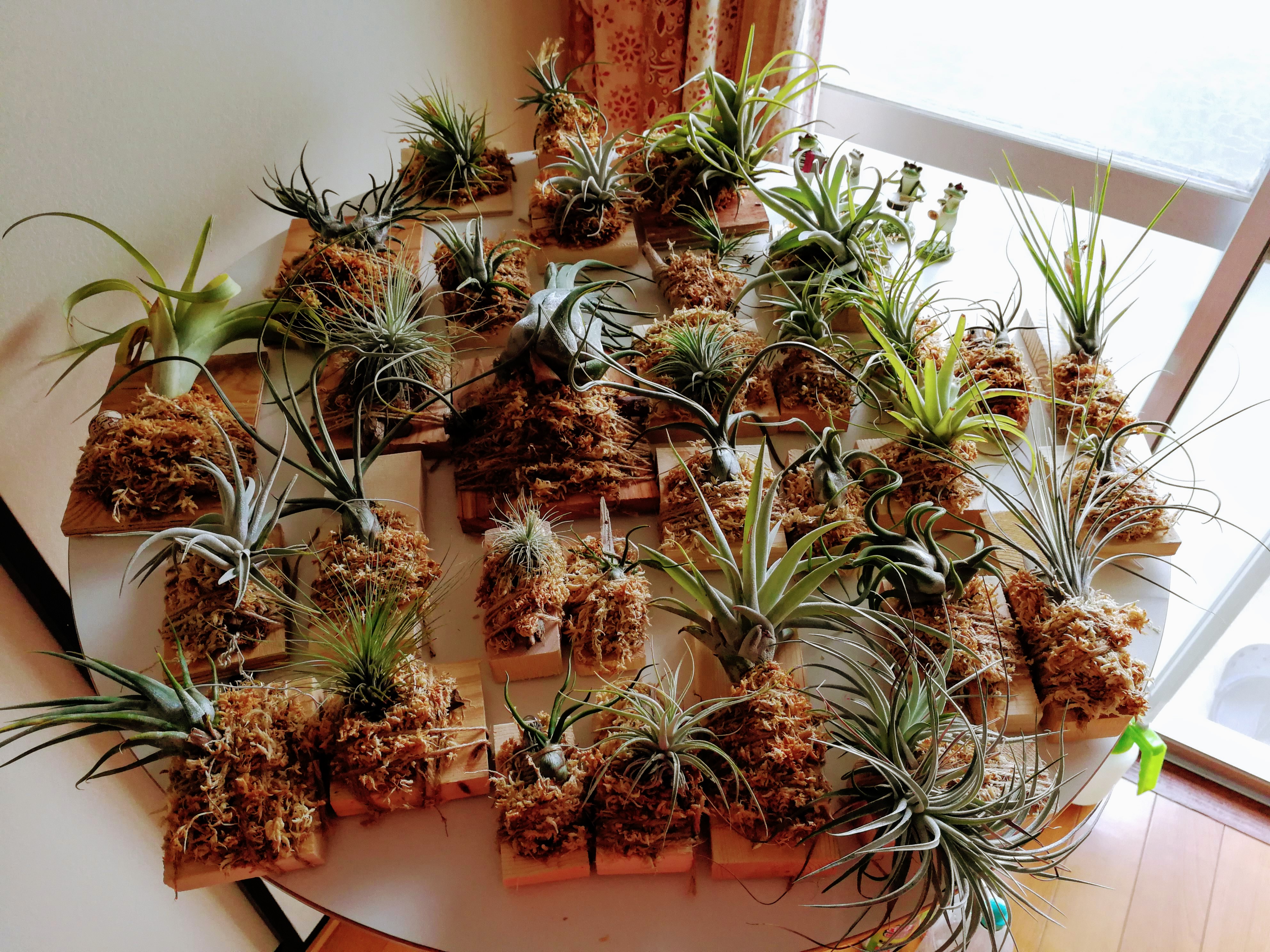 全部で30個くらいあります。2日間かけてやりました。基本的には麻ひもでエアプランツと水苔と板を固定しています。園芸店などではボンドで固定しているところもあるみたいですが、それはちょっとアレだなと思ったので、頑張ってひも固定しました。