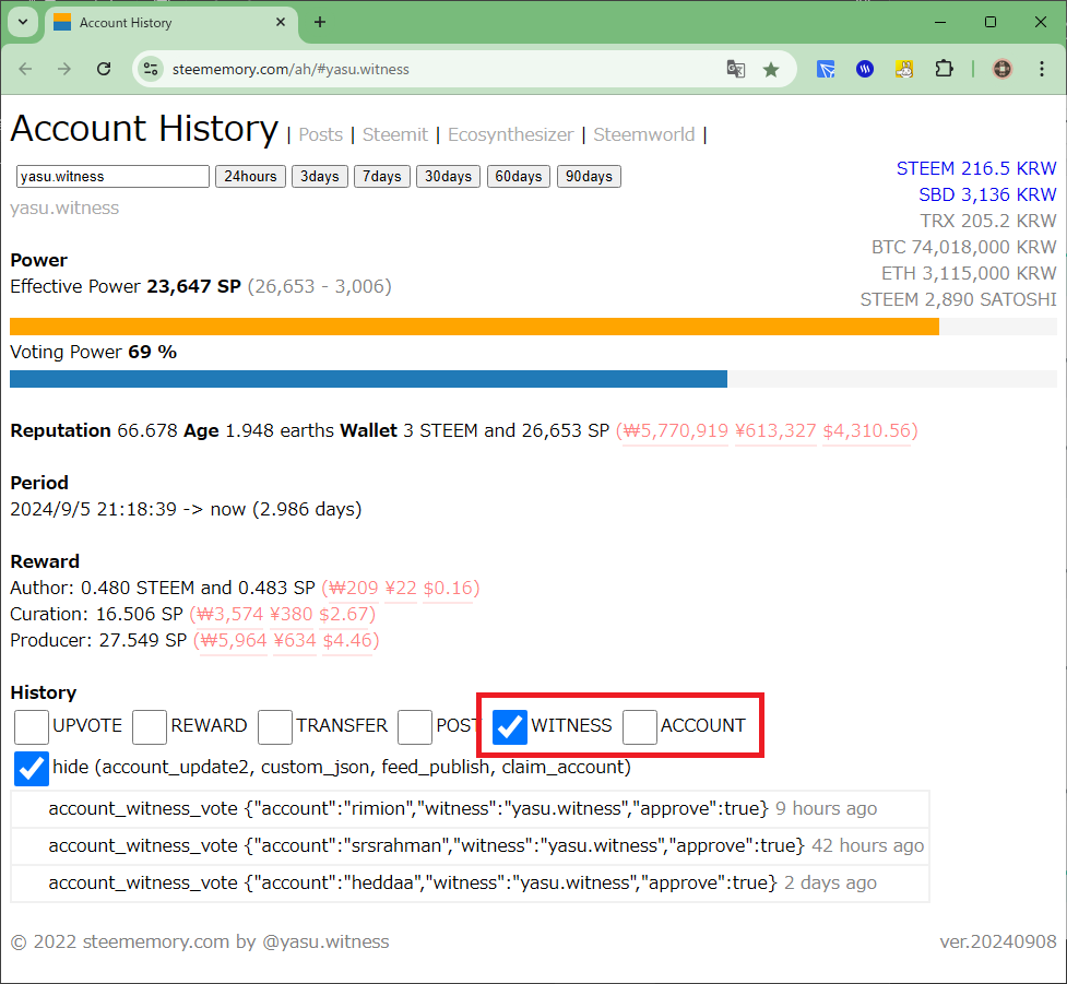 [Dev] Account History ツールを更新しました。yasu (81)in #japanese • 2 years ago こんにちは、@yasuです。 Account Historyツールに、機能を追加しました。 オプション表示対象 WITNESS証人投票 ACCOUNT盗難アカウントの回復、パスワードの変更 https://steememory.com/ah/ #dev