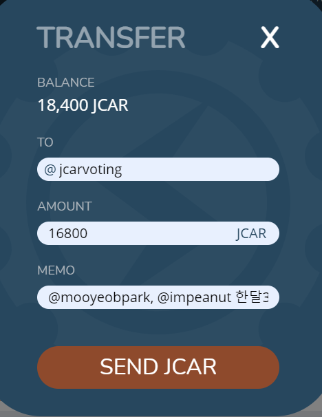 jcar로 참여 위 3가지 중 하나를 선택해서 @jcarvoting 으로 jcar를 전송하신 뒤 이 포스팅에 댓글 적어주시면 됩니다.