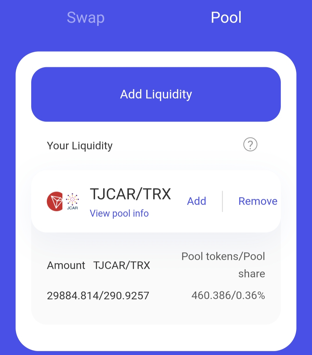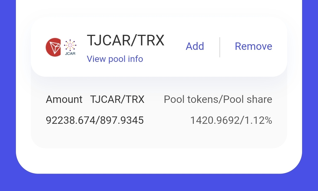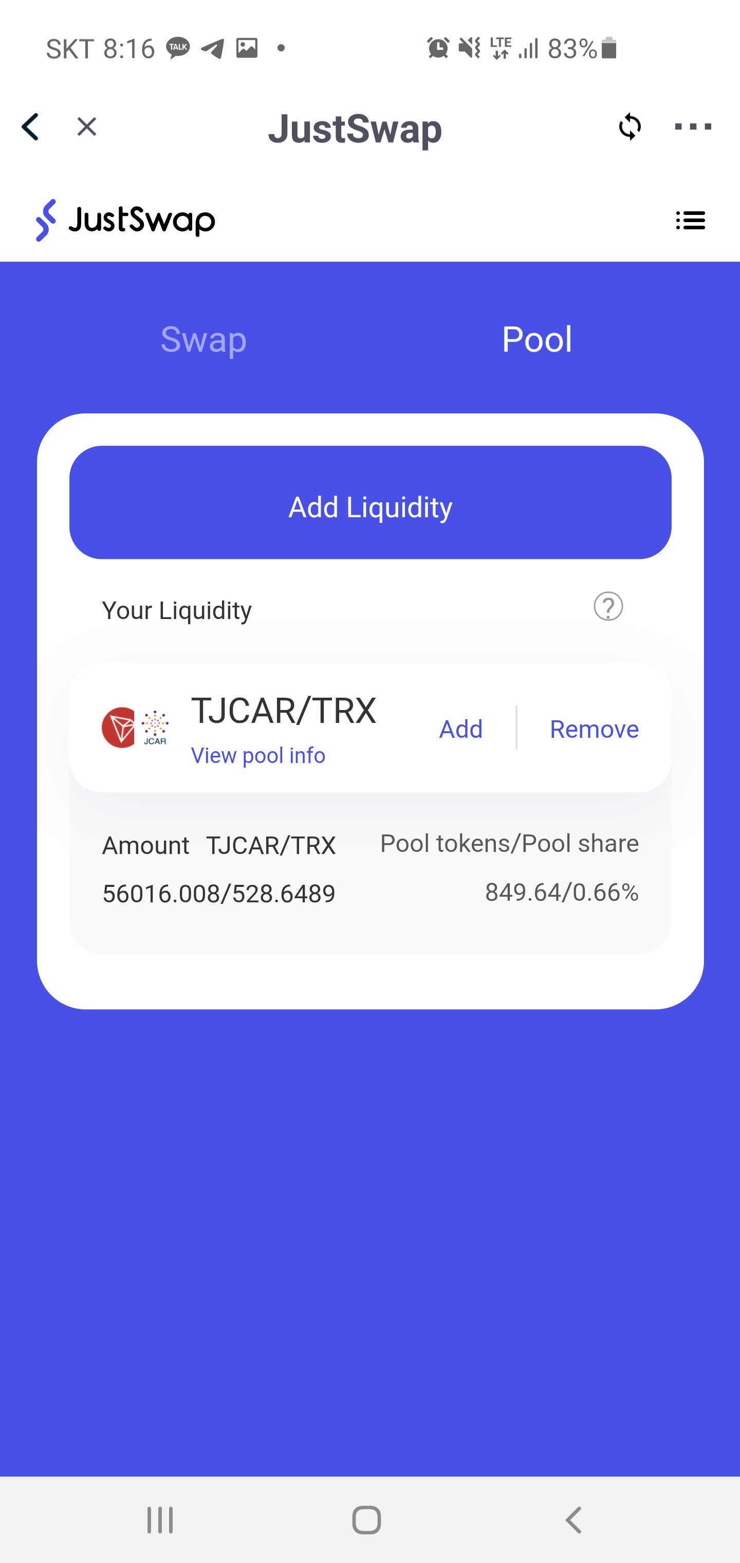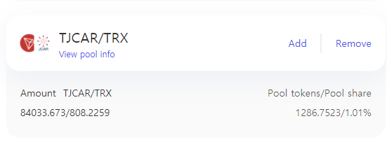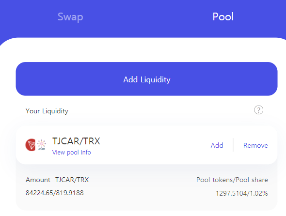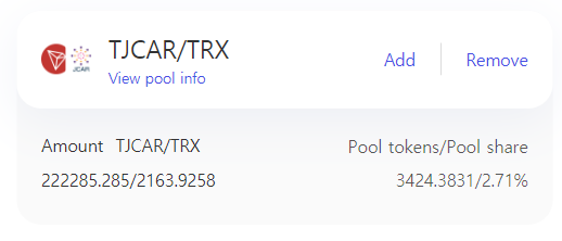TJCAR-TRX 유동성 공급 LP토큰 잔고 확인입니다.