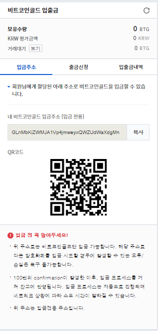 업비트로 이동해서 로그인 하시고 입출금에서 비트코인 골드를 찾으셔서 신규주소받기를 클릭하시면 위와 같이