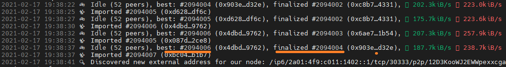 Now our node has started synchronizing - it will take several hours, you can find out that it has synchronized by looking at the best and finalized blocks - they should be the same. You can also check your node on the polkadot website