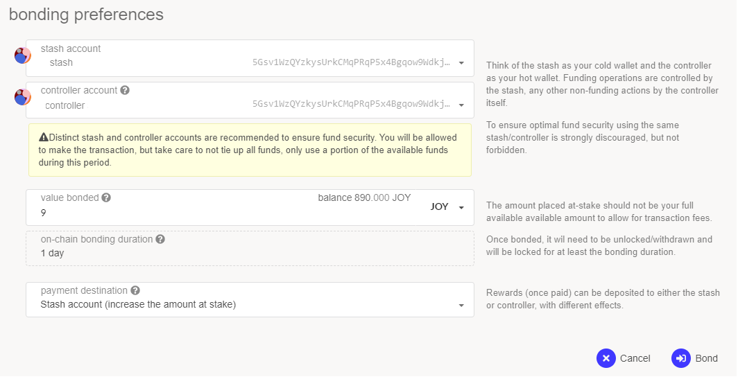 On the site, select Validators on the left - then Account actions - press + Stash. We select the stash and controller accounts, the amount of the stake and carry out the transaction. If everything went well, the Set Session Key button will appear - by clicking on which we will paste the copied key from our VPS <0xa0very0long0hex0string> (replace it with your own)