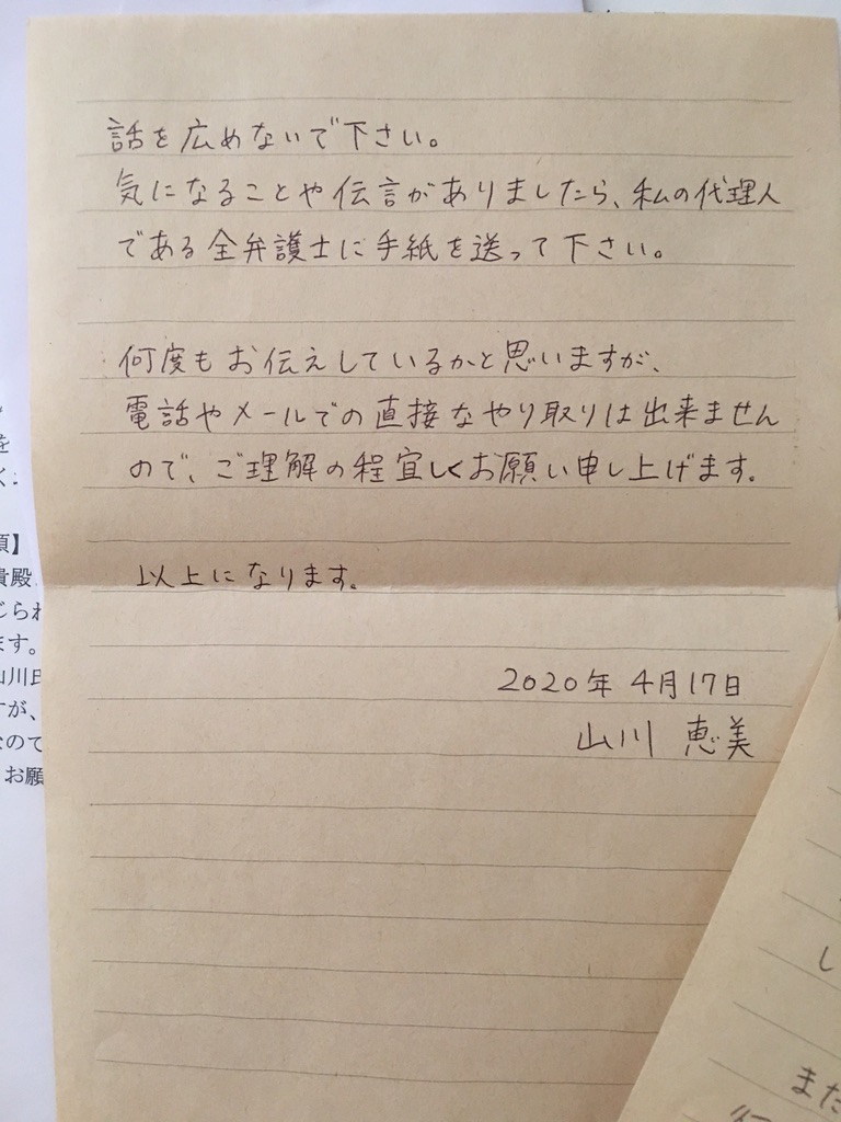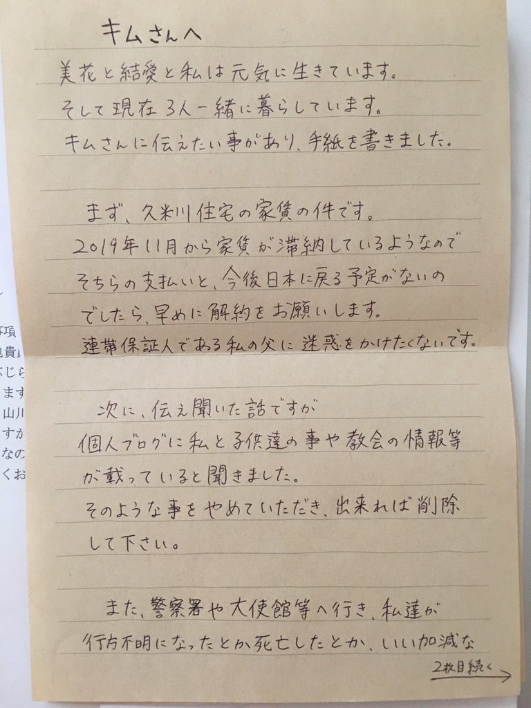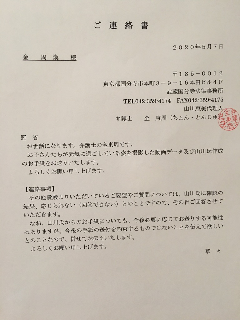 2020年5月13日に貰った(弁護士と言ってる)全東周からの自分の妻の手紙と子供立ちの動画