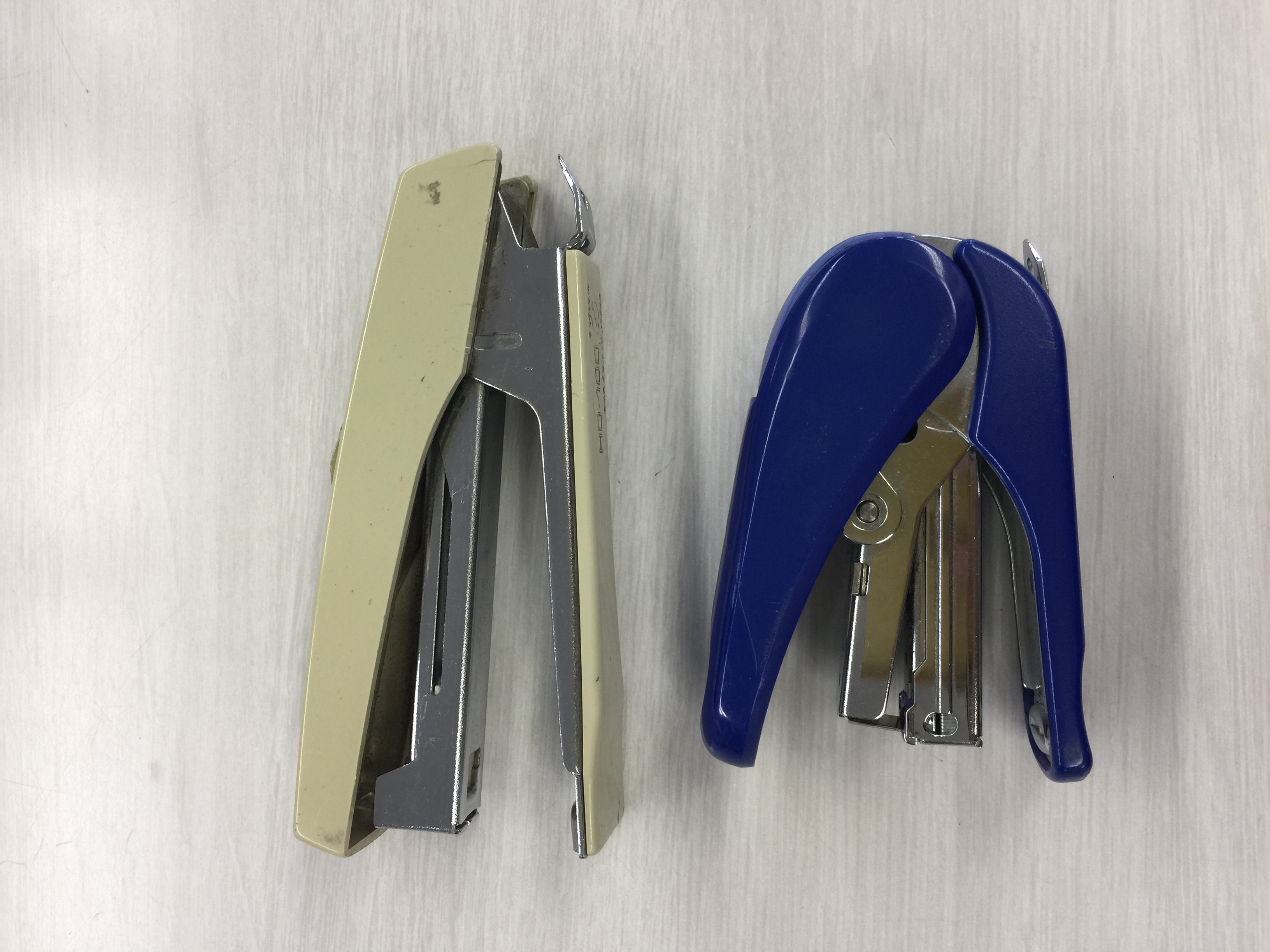昔は写真の左のようなホッチキスが多かったと思います。