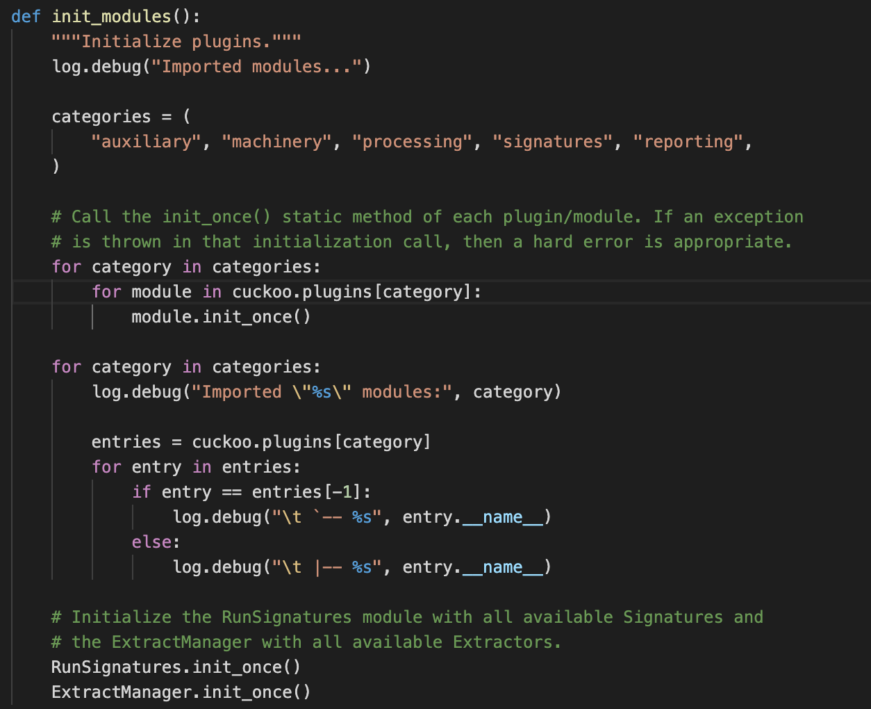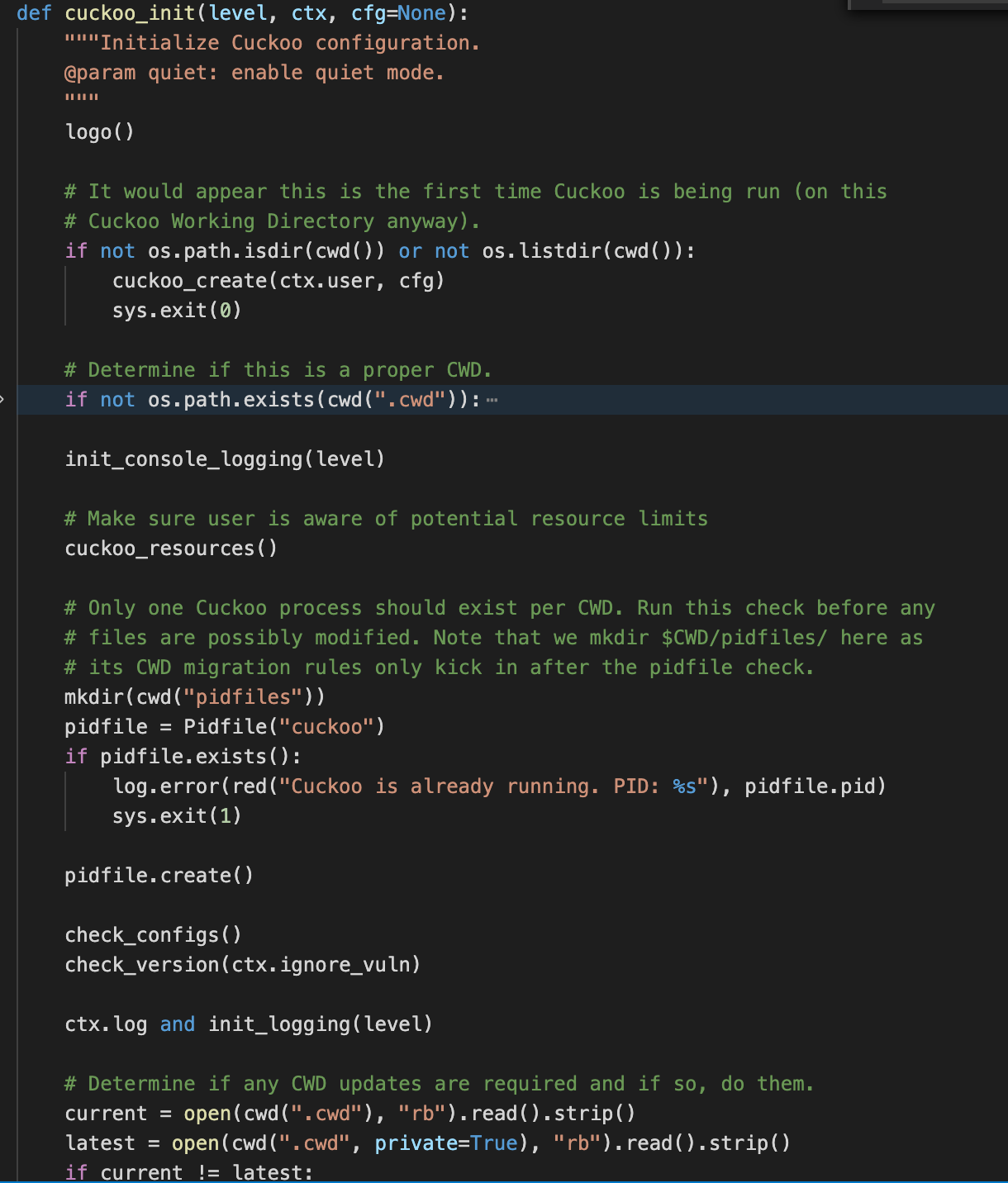 cuckoo_init(level, ctx) # level --> specifies the level of output (debug or quiet), ctx is an object of click.core.
