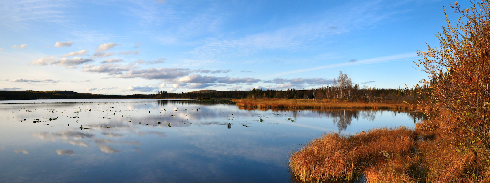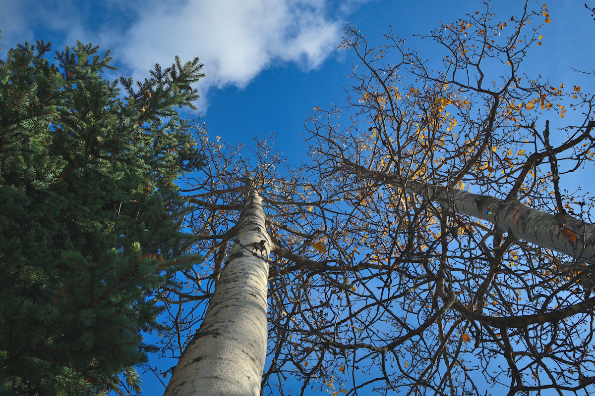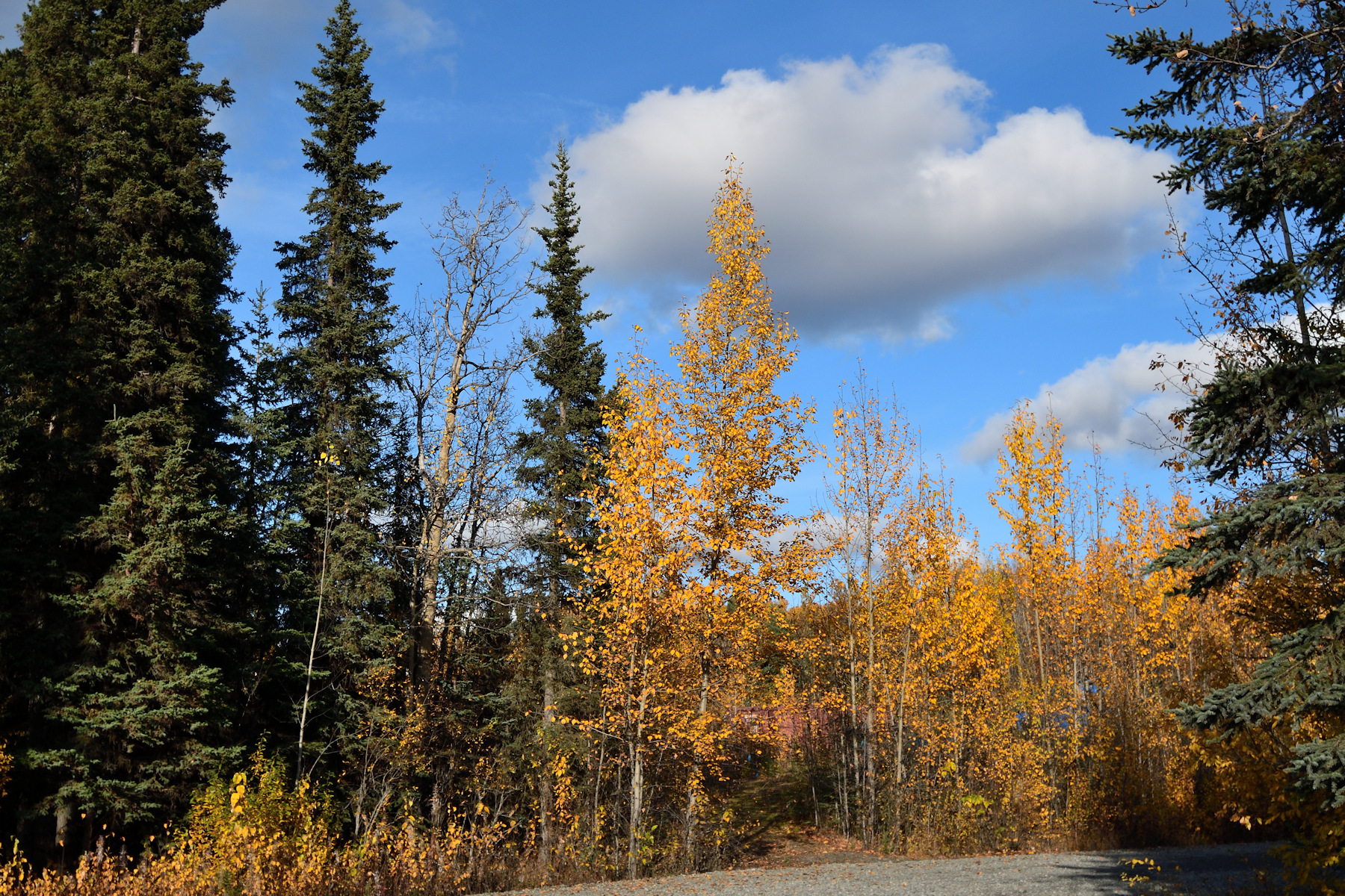 Framed by the evergreen green of the spruce trees, the leaves on these few birch looked great, especially with some blue sky and a little bit of cloud action going on.