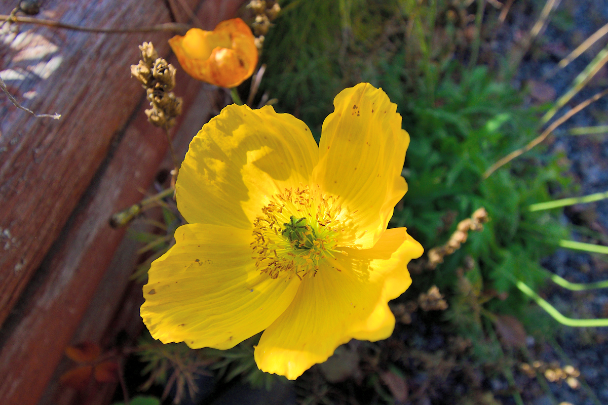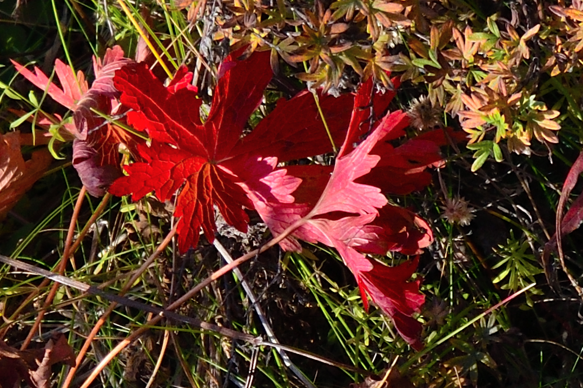 I am pretty sure they are the leaves of the Alaskan Geranium plant, but I do not recall from any previous stops if they had them in the garden. I do love the way the leaves turn that Maple Tree Red Leaf color. While I was capturing that, I got eye bombed by another color splash.