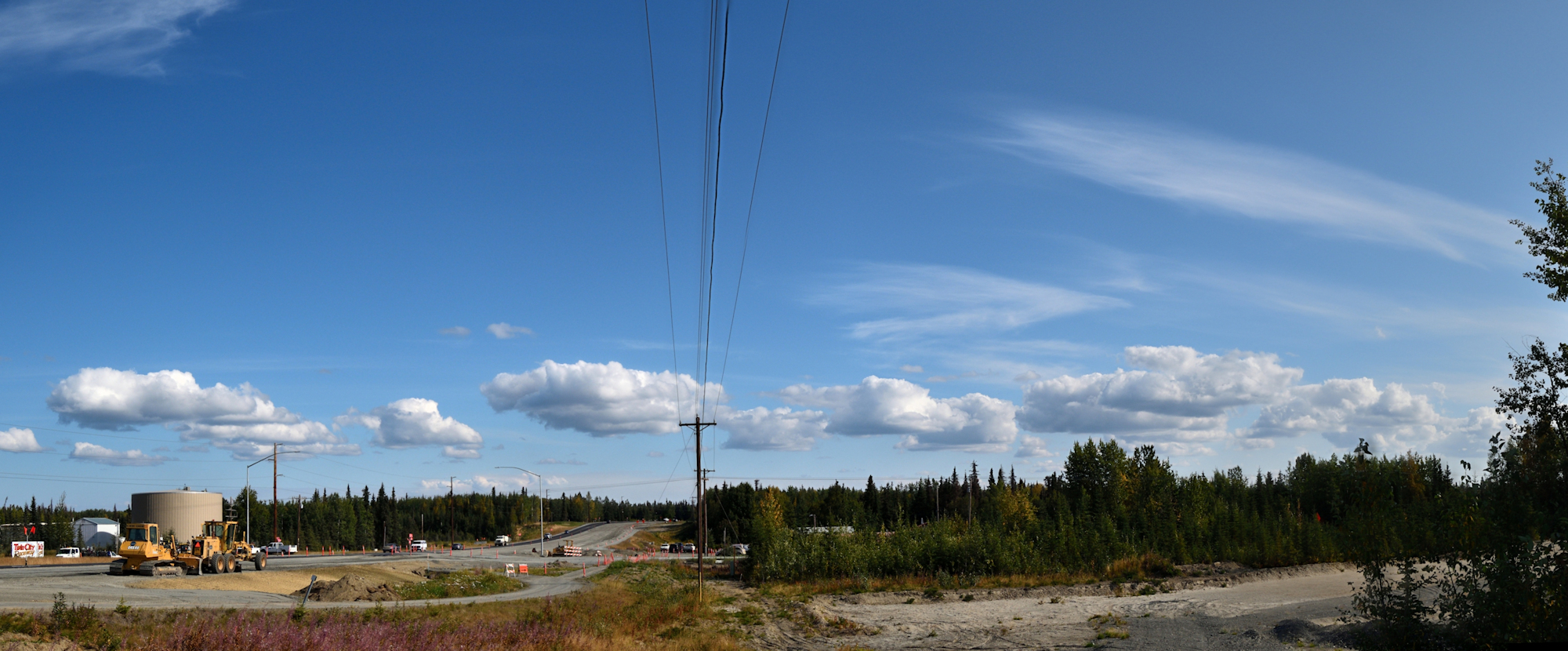 Steemit has it's hard fork that they have been working all summer on, and in Alaska we have a lot of construction going on. I liked the clouds in this picture, so I took three of them and stitched them together with Auto Stitch. The picture also happens to highlight one of the many major road constructions we currently have going on. The road here is the Kenai Spur Hwy. It connects the cities of Kenai and Soldotna, There has been a substantial amount of growth in these two areas over the last few years, so they are taking it from the two lanes to five lanes, (a center turn lane).