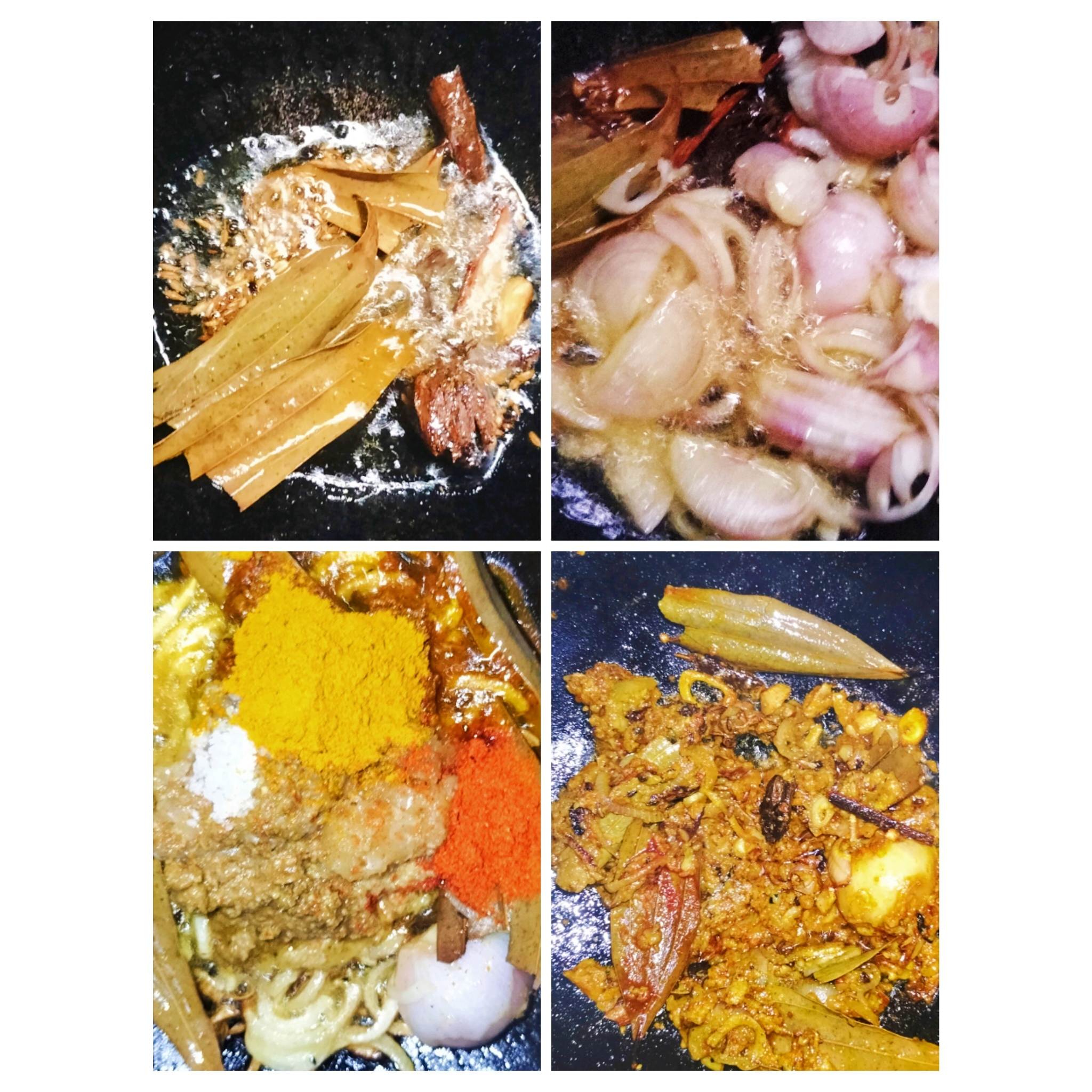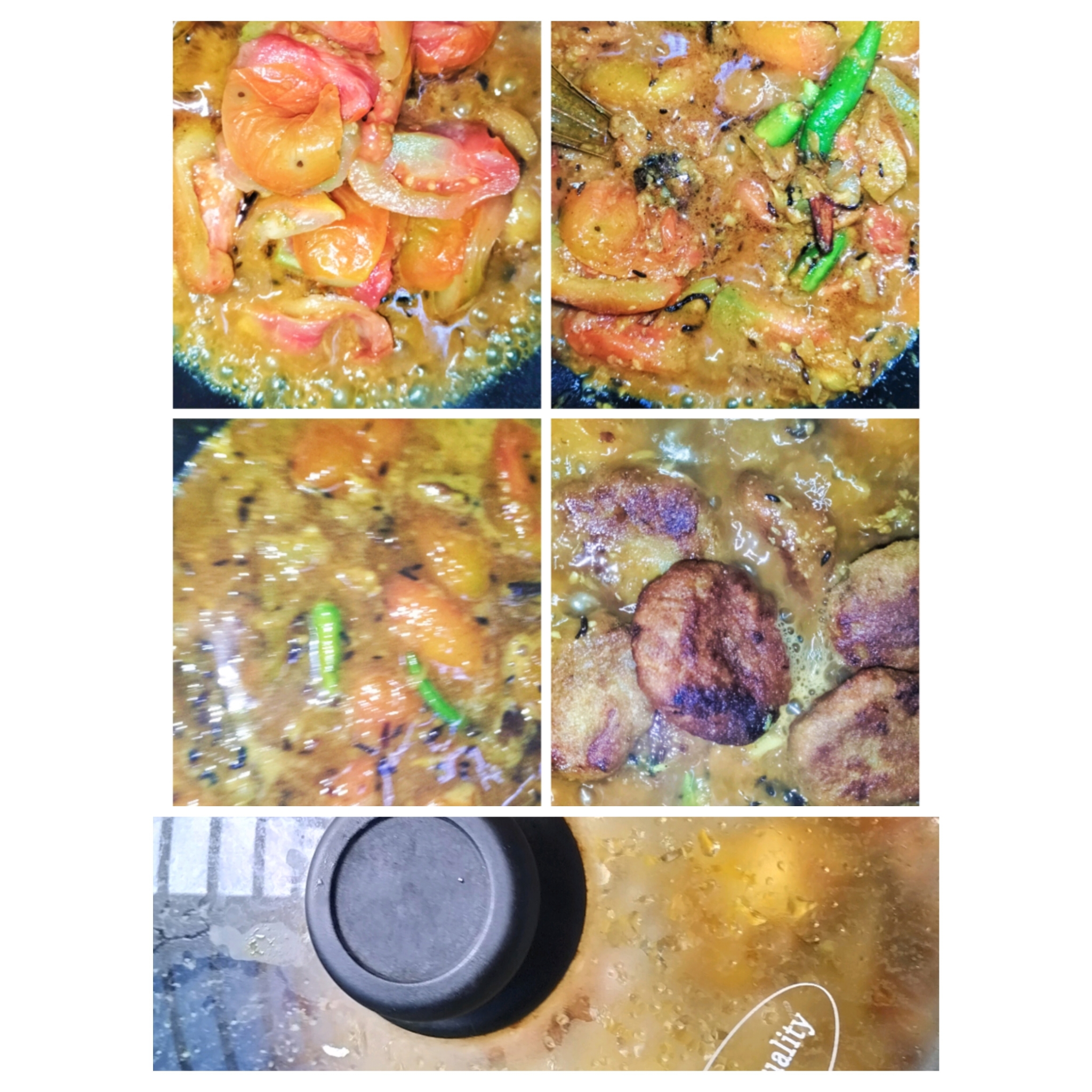 বড়া গুলো ভাজা হয়ে গেলে তুলে নিয়েছিও কড়াইয়ে পেঁয়াজ কুচি,জিরা,তেজপাতাও গরম মসলা ফোঁড়ন দিয়েছি এবংআদা,জিরা,পেঁয়াজ,সব বাটা উপকরণ দিয়েছি,লবন,হলুদ, মরিচ গুড়া,টমেটো দিয়ে ভালো করে কষিয়ে নিয়েছি।