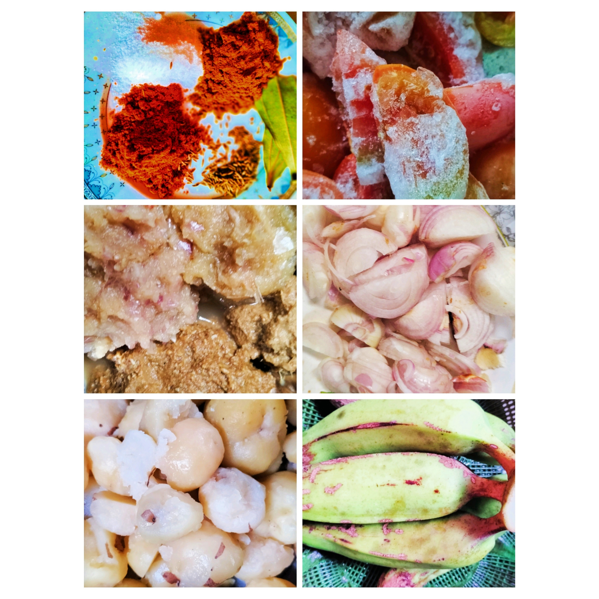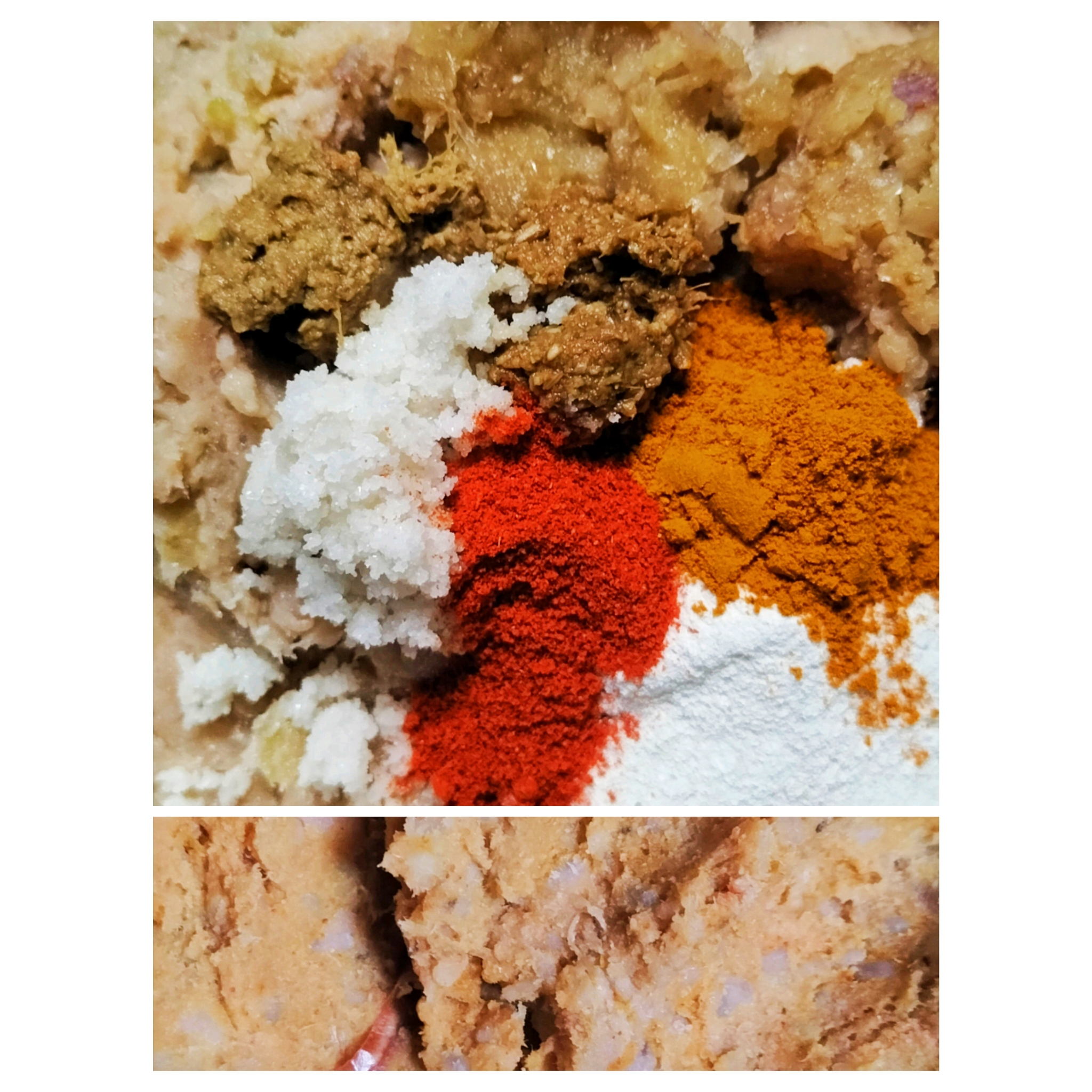 এখন আমি কাঁচ কলা অনুষদভুক্ত ও আলু চকটানো গুলোতে আদা বাটা,রসুন বাটা,পেঁয়াজ বাটা,চালের গুড়ি,হলুদ,মরিচের গুড়া,লবন একে একে সব উপকরণ গুলো দিয়ে আবারও খুব ভালো করে মেখে নিয়েছি।