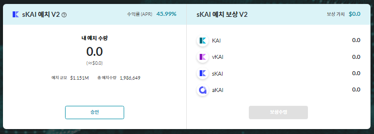 SKAI 단일 예치에는 KAI, VKAI, SKAI, AKAI 토큰 보상이 있습니다.