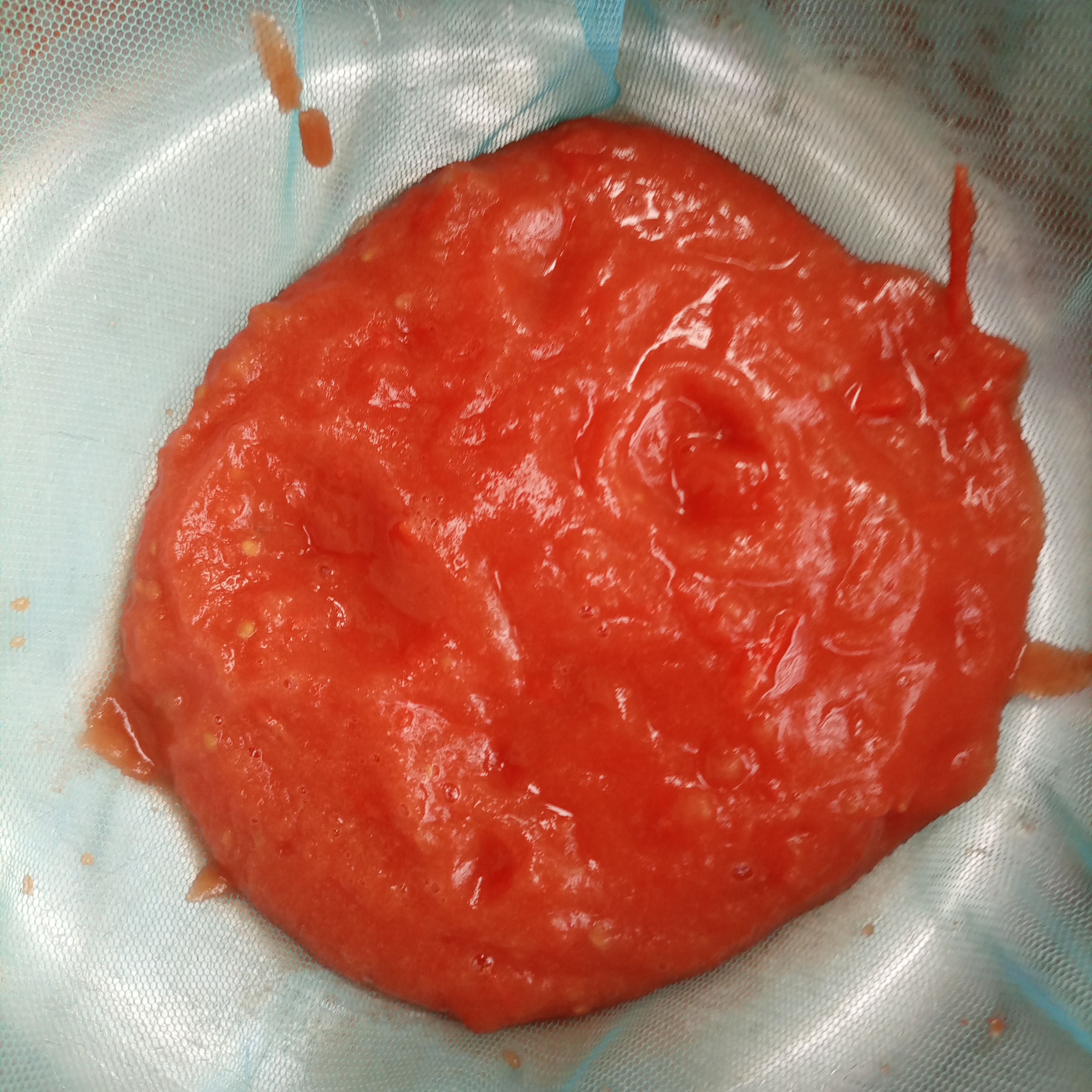 The skin of the tomatoes started to peel off, which meant that they were completely ready. I left them to cool for a while, then put them in the jug of the juicer machine and started grinding. After a while, it was completely ground. After that, I filtered it through a mesh cloth.
