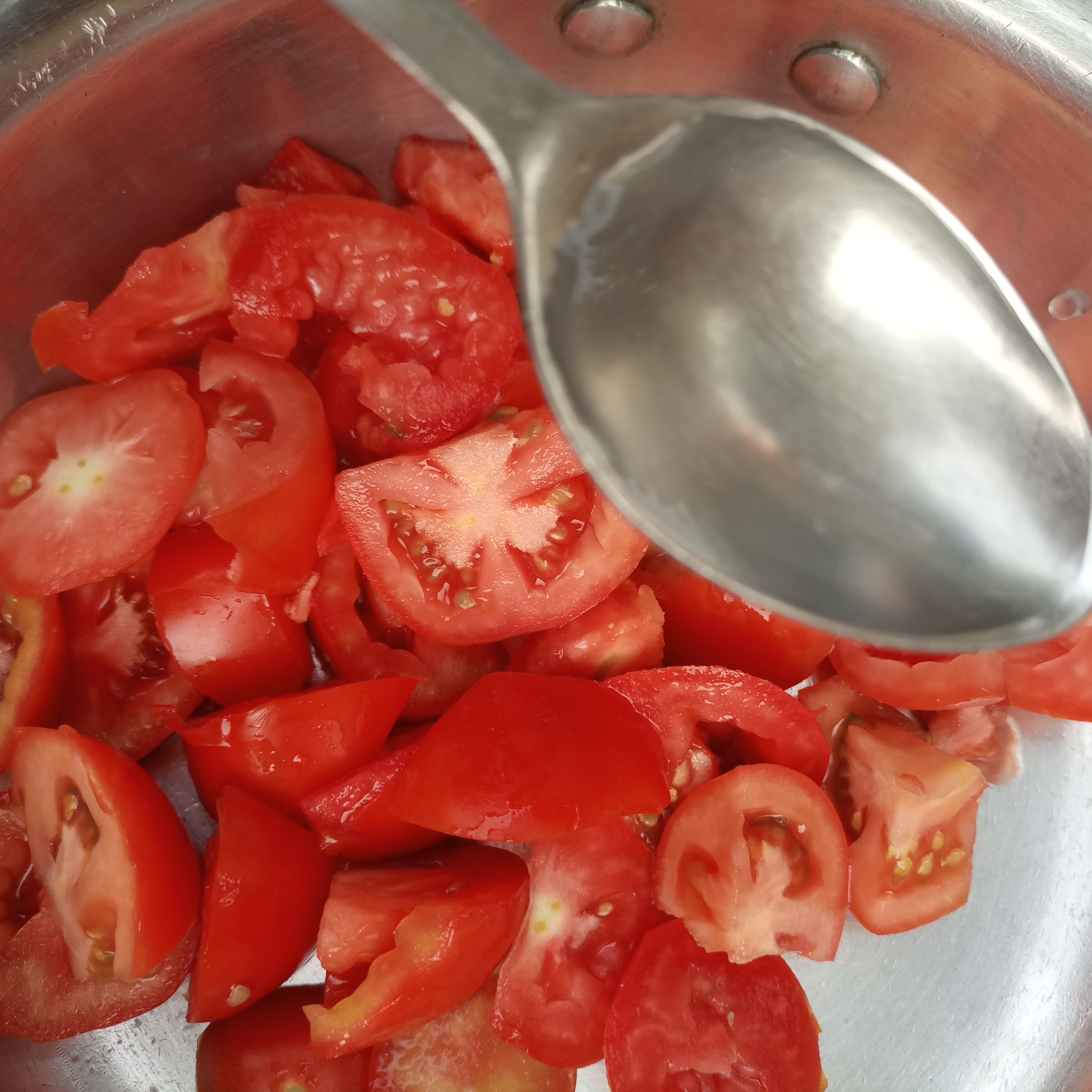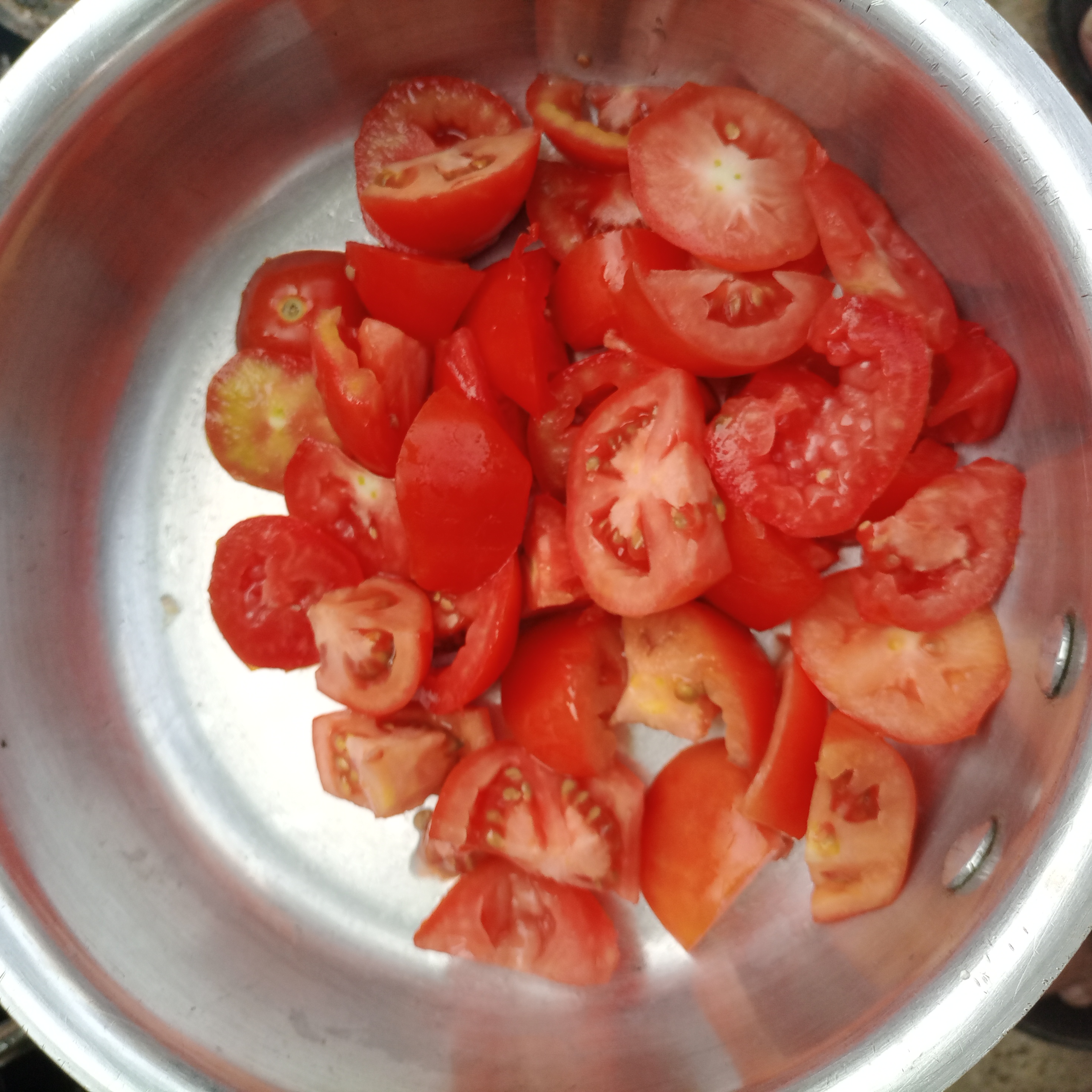 As the name suggests, this is a green ketchup, so to maintain its green color, I don't need to add too much tomato, so I added 350 grams of tomatoes. First, I washed the tomatoes well with water, then cut them into small pieces with the help of a knife, then put them in a pot and placed them on top of the chickpeas. I slowly turned on the heat and added about four tablespoons of water to it so that it would boil quickly and I could get its solution.