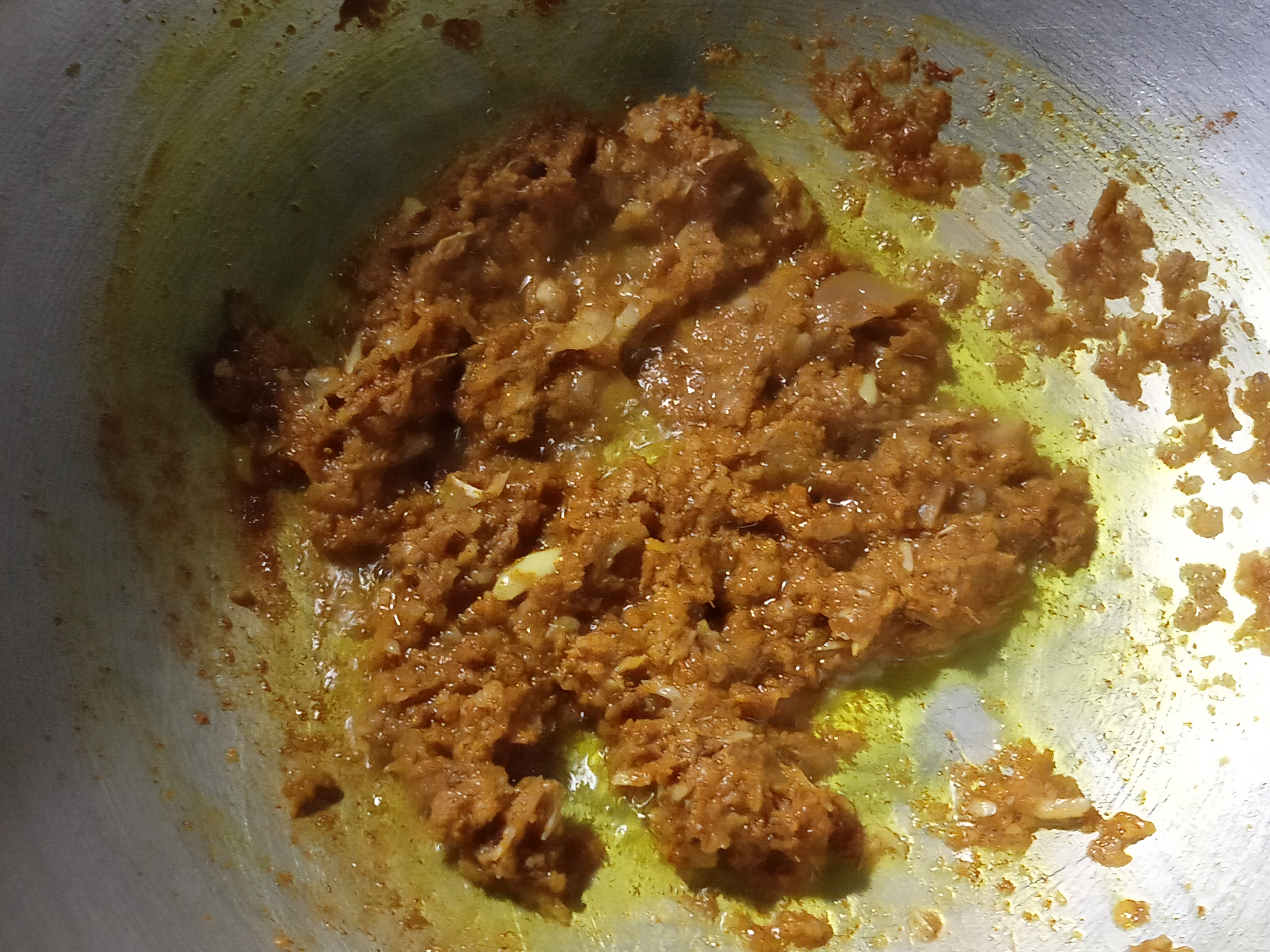 এখন কড়াইতে তেল গরম করে সকল প্রকার বাটা মশলা এবং গুড়া মশলা দিয়ে নেড়েচেড়ে কিছুটা নারিকেলের দুধ দিয়ে মশলা গুলো ভালো করে কষিয়ে নিতে হবে।