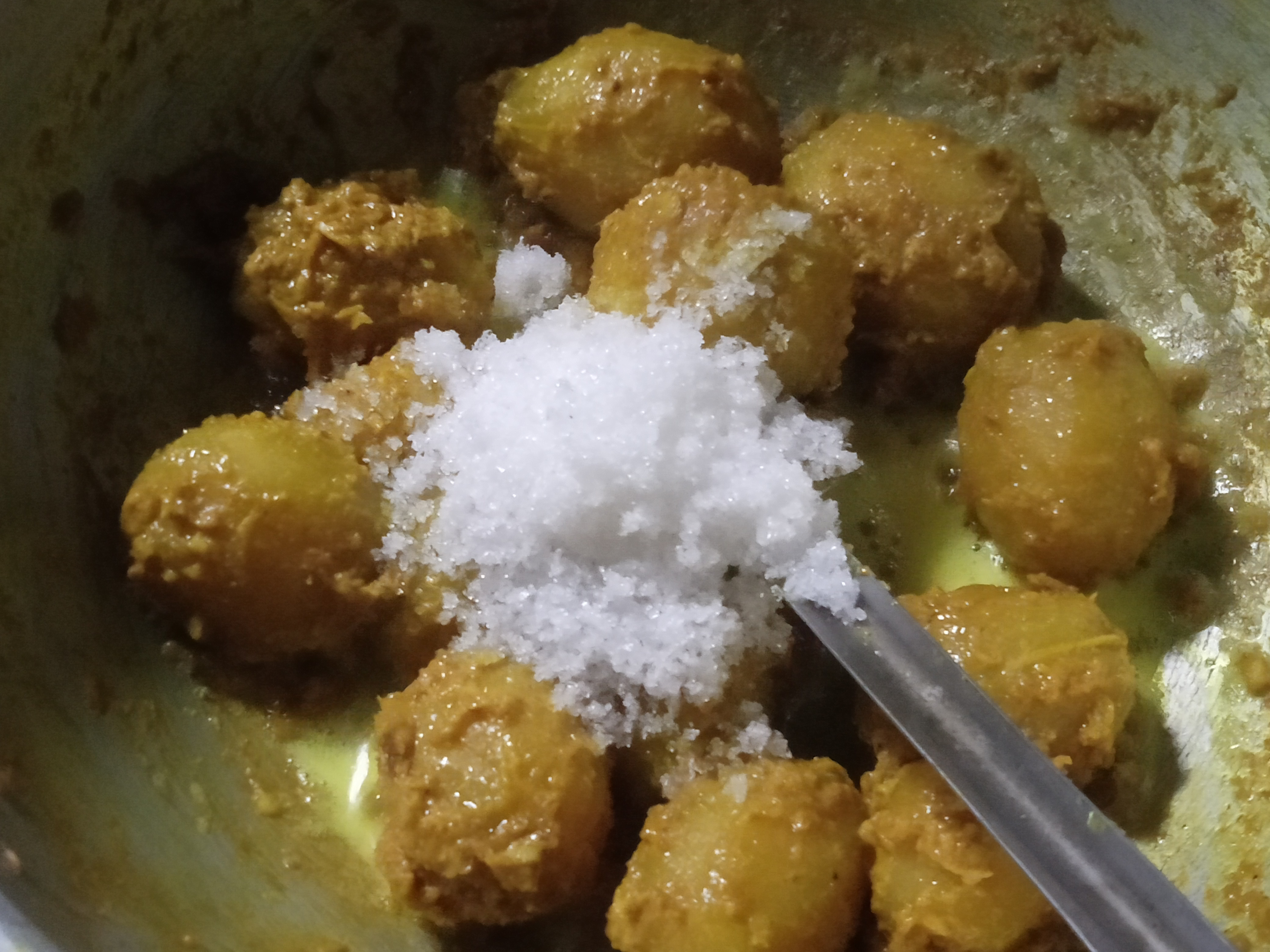 কষানোর এক পর্যায়ে এক কাপ চিনি দিতে হবে।যে যেমন মিষ্টি পছন্দ করেন সে তেমন দিতে পারেন।