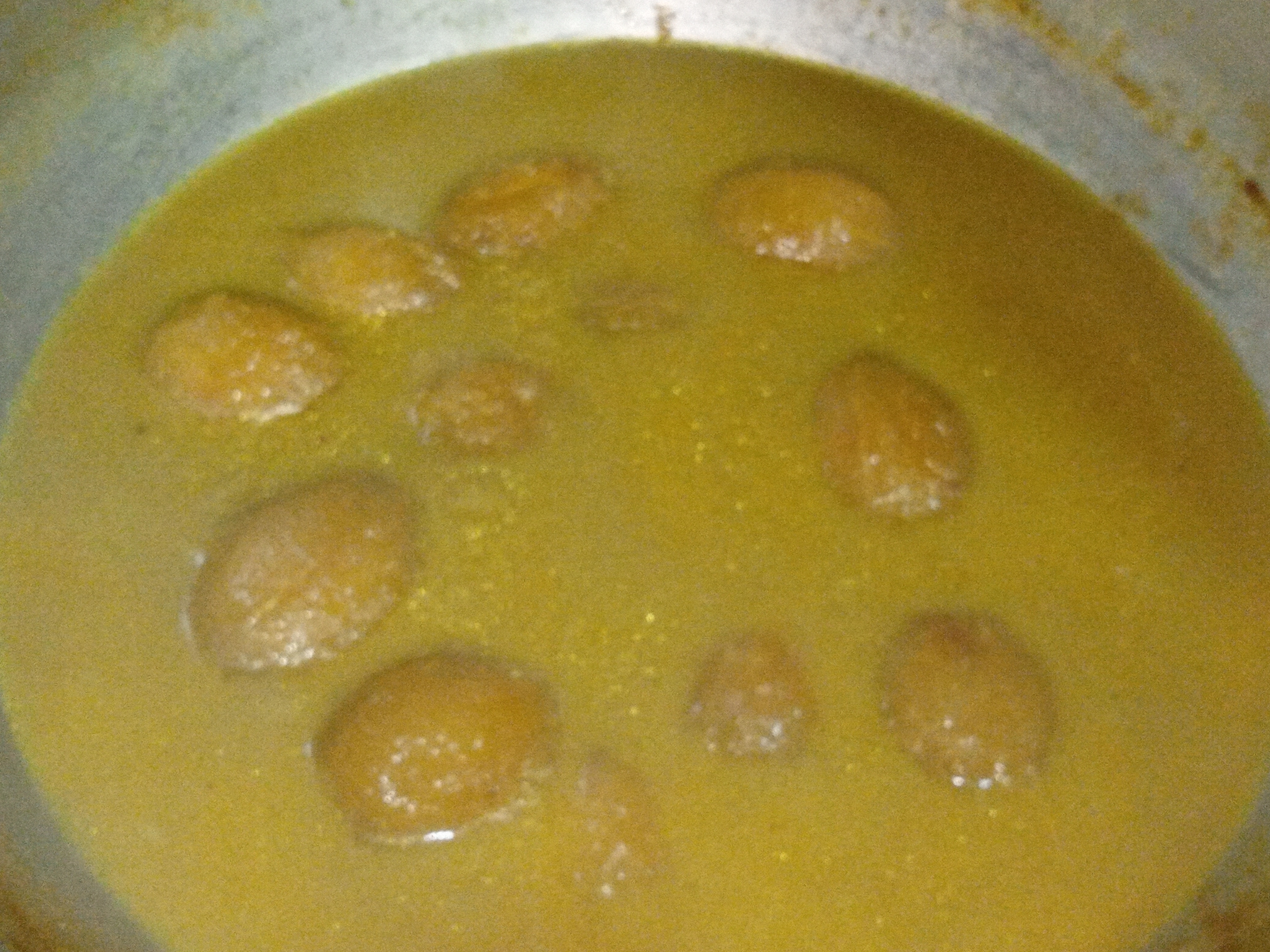 তারপর মশলা কষানো হয়ে গেলে আমড়া দিয়ে নাড়িয়ে অর্ধেক পরিমান নারিকেলের দুধ দিয়ে ঢাকনা দিয়ে ঢেকে খুব ভালো করে কষাতে হবে।
