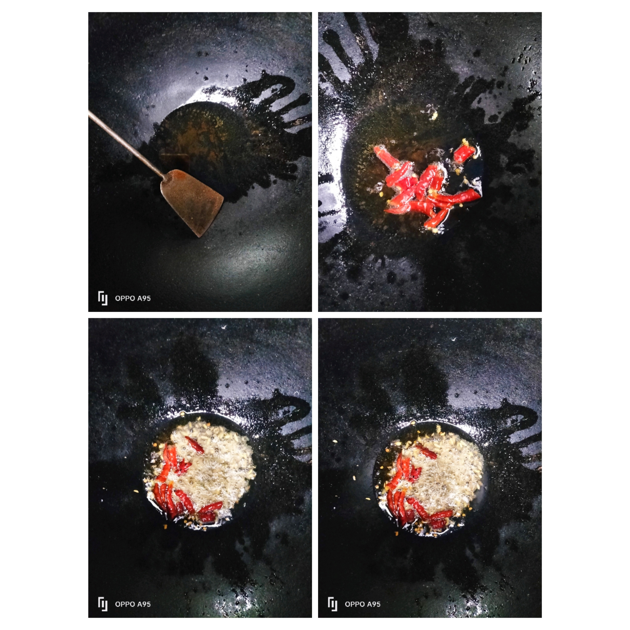 এখন চুলায় একটি কড়াই বসিয়েছি ও তাতে তেল দিয়েছি তেল গরম হয়ে গেলে তাতে শুকনা মরিচ ও পাঁচফোড়ন দিয়ে ফোঁড়ন দিয়েছি।