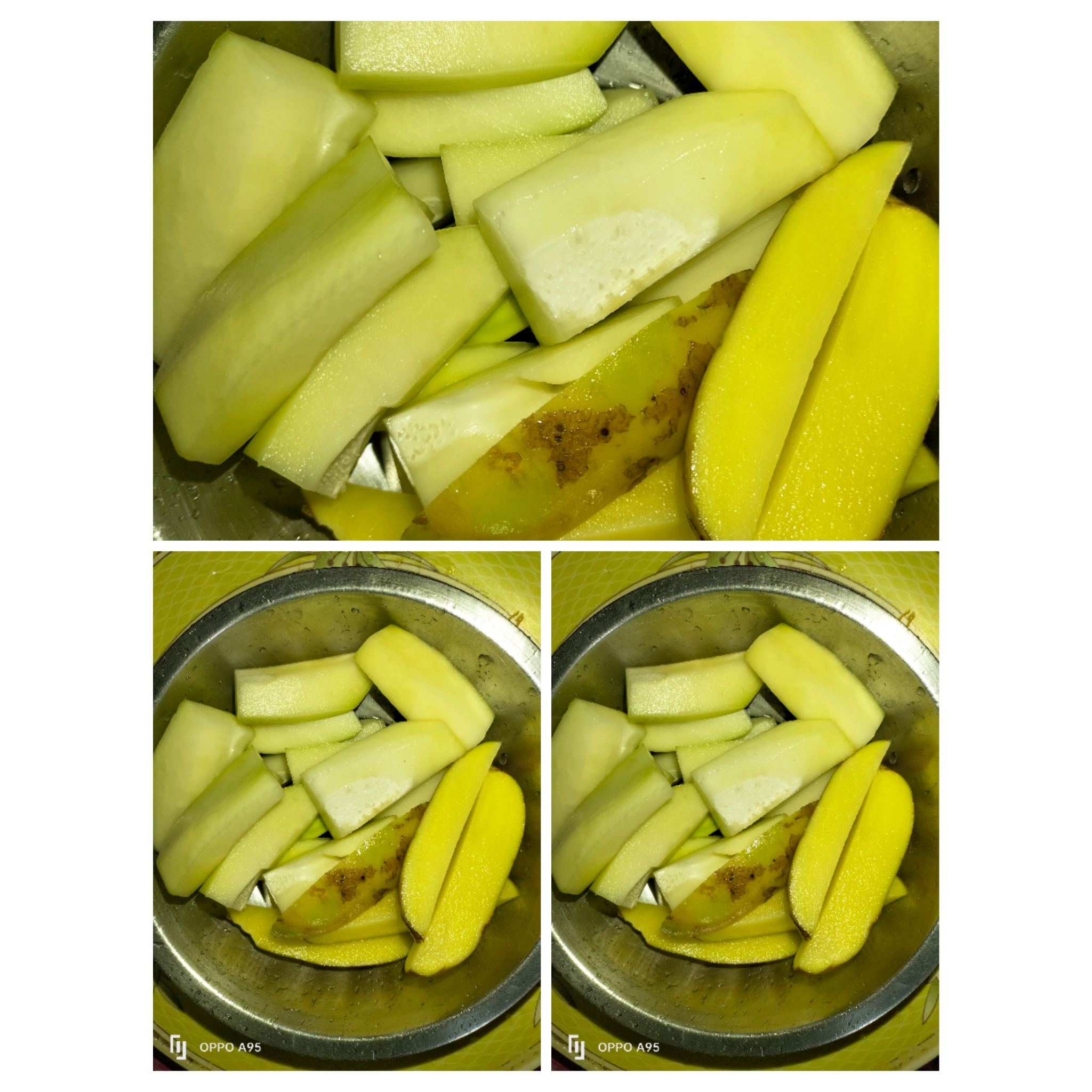এখন একটি ছোট আকারের পেঁপে কেটে নিয়েছি এবং একটি আলু কেটে নিয়েছি।