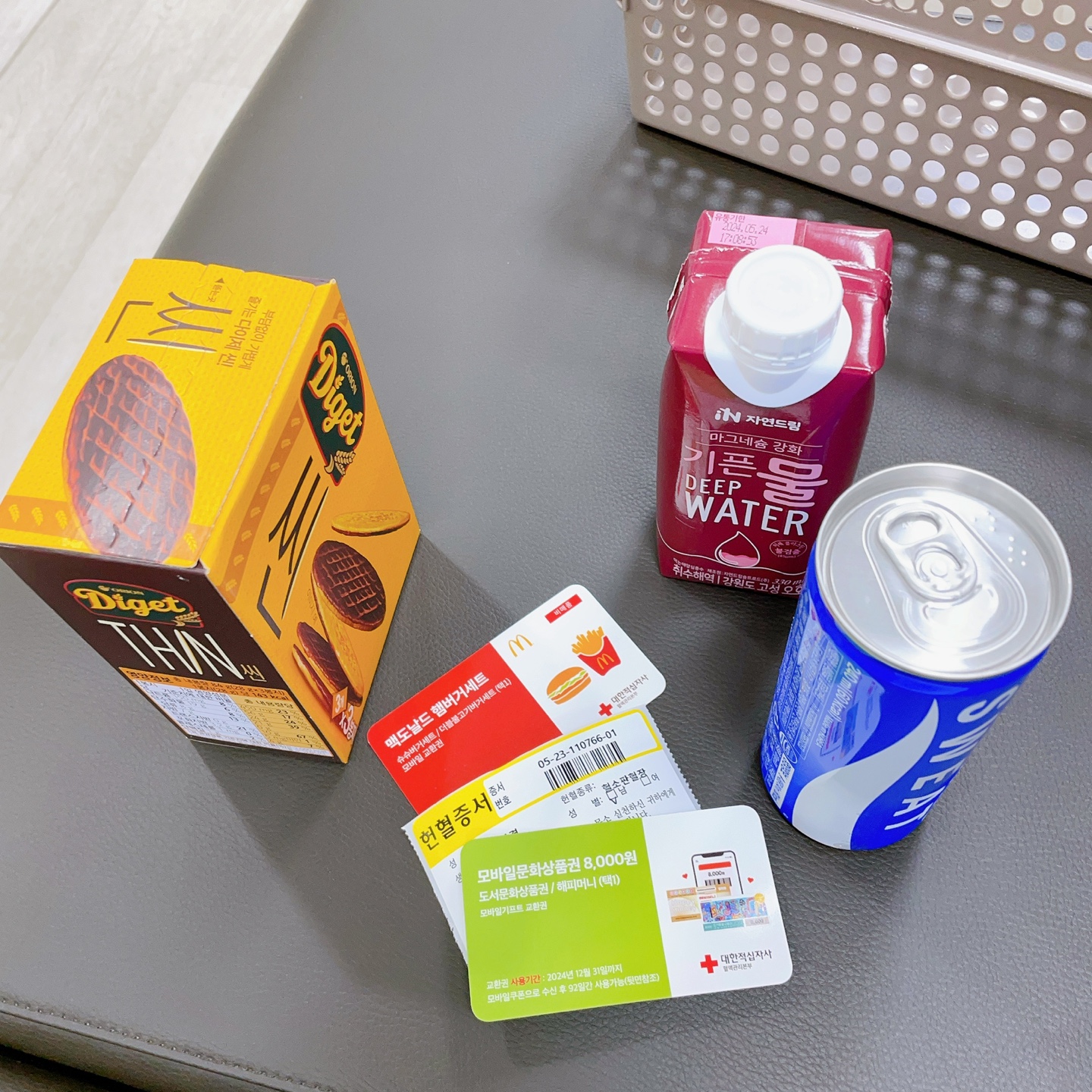 이번에도 잔뜩 받아왔다. 화성시에서 지급하는 상품권을 받은데다 올해 헌혈 누적에 대한 보상으로 상품권을 하나 더 받았다. 혈소판/혈장 헌혈은 선물을 두 개나 고를 수 있는데 모바일상품권과 햄버거 쿠폰을 선택했다. 헌혈 한 번으로 책 하나를 구입하고 한 끼를 해결할 식량을 얻었다. 게다가 음료와 과자는 덤이다. 내가 나누는 것이 아니라 나눔 받는 것 같은 느낌이 들었다. 받은 것보다 더 많이 베푸는 사람이 되어야겠다.