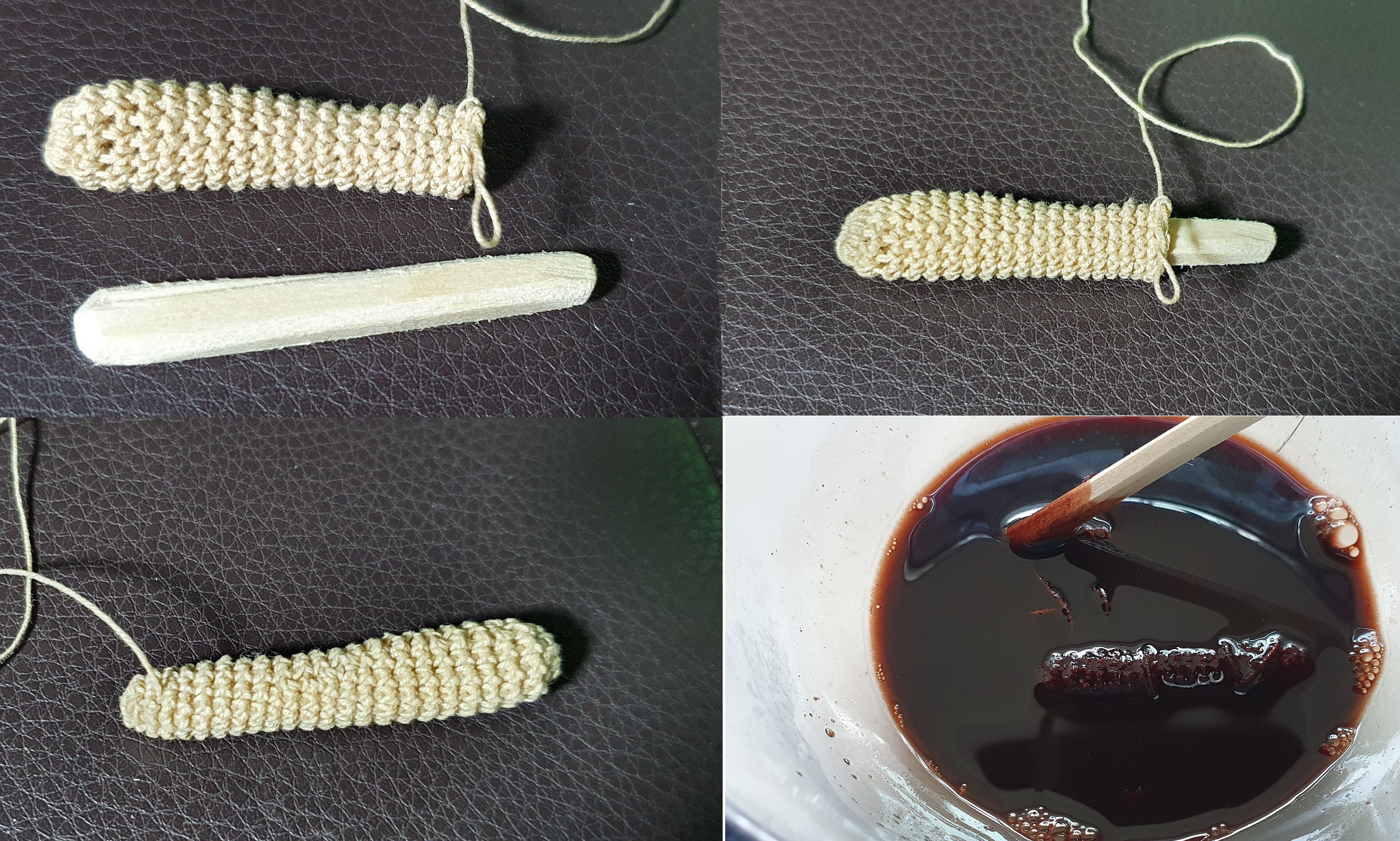 가방에 달아줄 단추가 마땅치 않아 나무젓가락 잘라 다듬고 감싸고 염색해서 만들었다.
