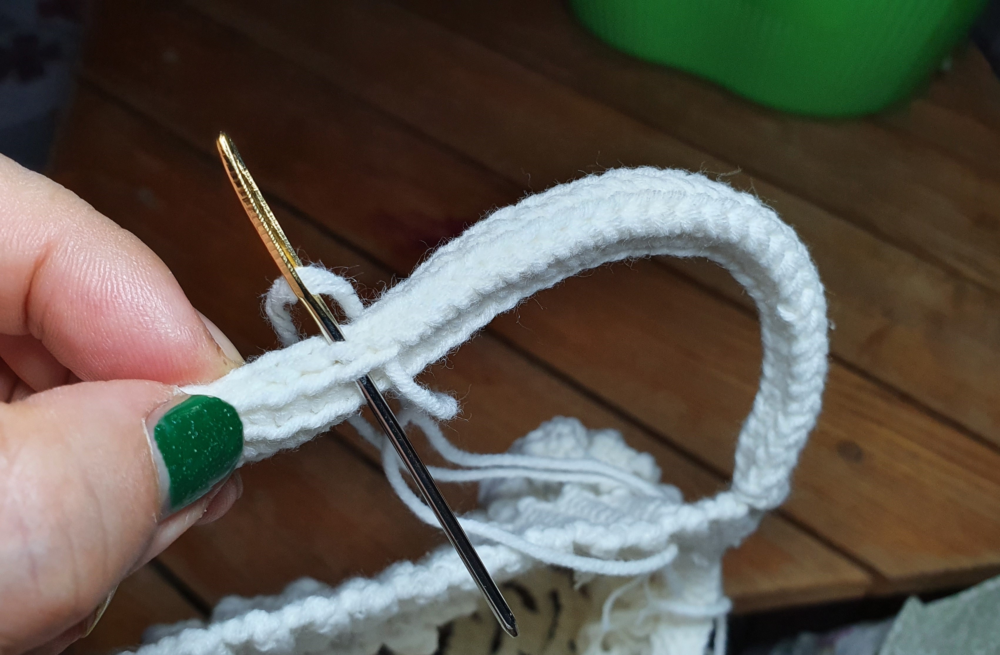 납작하게 뜬 끈은 맞잡아 바느질로 이어 동그랗게 만들었다.
