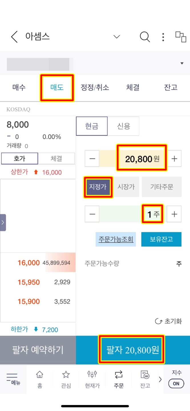 난 따상을 먹는 것을 목표로 했기 때문에 따상의 가격 20,800원을 설정해놓고 장이 시작되자마자 매도예약을 해 놓았다.