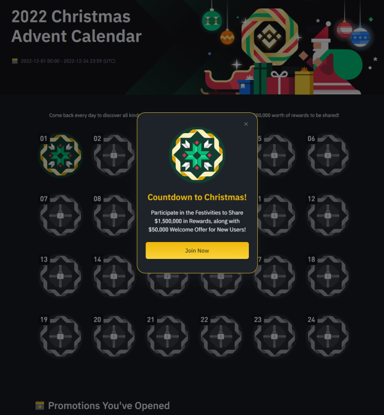 매일매일 Binance Advent Calendar로 출석하는 개념입니다.
