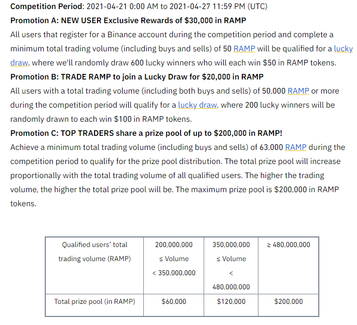 5만개 이상의 RAMP를 거래한 유저 추첨, 200명에게 100달러 상당의 RAMP 지급.PROMOTION C : 상위 RAMP거래 20만달러 상금풀