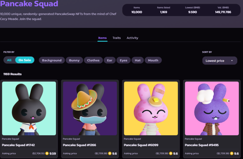 팬케이크 스왑 스쿼드 NFT는 9/29(목) 현재 바닥가격이 9.6 BNB(바이낸스 코인) 입니다.
