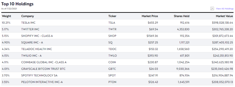 그리고 더 작은 규모DLS 6.3B 정도의 ARKW를 보면 똑같이 테슬라, 스퀘어, 코인베이스도 있지만 트위터가 있고