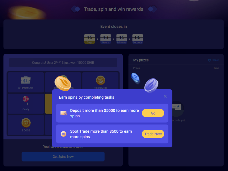 디파짓 금액, 거래 금액에 따라 룰렛을 돌려서 리워드를 주는 이벤트도 하고있으니