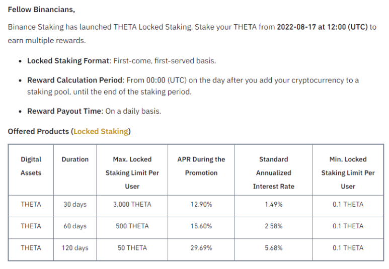 바이낸스 거래소에서 쎄타(THETA)의 고이율 스테이킹 상품을 출시합니다.