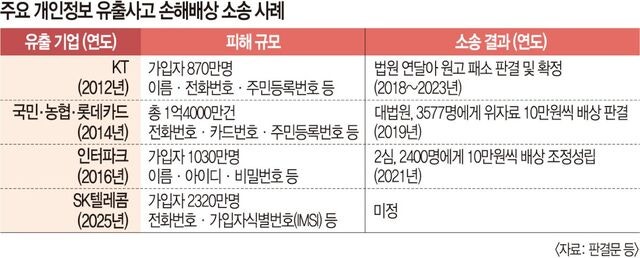 가장 최근 판결난 모두투어 개인정보 306만명 유출 소송에서도 피해자당 10만원씩 지급하라는 배상 판결.(국민)