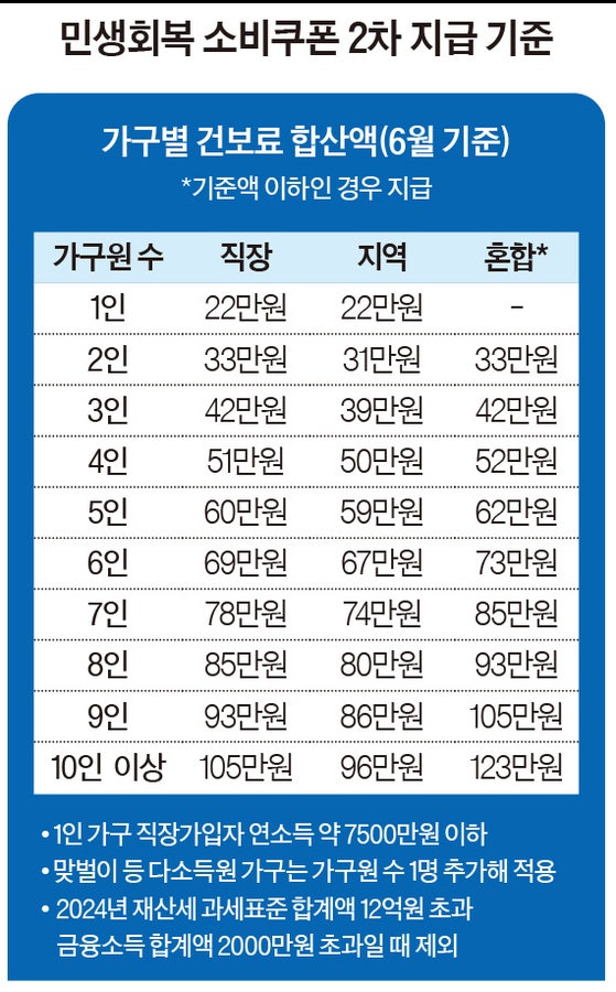 - 22일부터 2차 민생회복 소비쿠폰 지급 확정 → 1인당 10만원. 제외되는 상위 10%는 기본적으로 건강보험료 기준, 여기에 ▷재산세 괴세표준 12억(시가 27억 내외). ▷이자,배당 등 금융소득 2000만원 이상 제외.(중앙선데이)