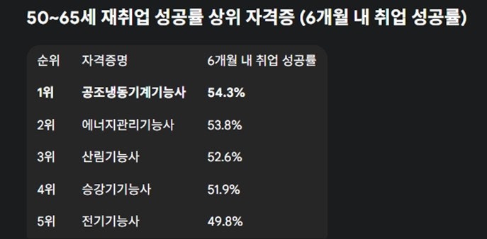 - 50세~65세 재취업이 가장 잘 되는 자격증 → 6개월내 취업 성공률 1위 ▷공조냉동기계기능사(54.3%) 이어 에너지관리기능사(53.8%), 산림기능사(52.6%), 승강기기능사(51.9%), 전기기능사(49.8%) 순. 첫 취업에서 급여가 가장 많은 자격은 ‘타워크레인 기능사로 월369만원.(매경)