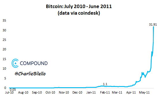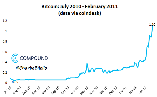 비트코인은 7개월 만에 2,100% 오른 1.10달러에 거래되고 있었다. 차트는 이런 모습이었다.