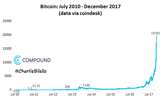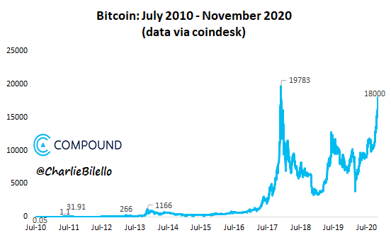 비트코인은 2013년 4월 최고치에서 1,597% 상승한 19,783달러에 거래되고 있었다.