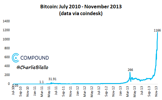비트코인은 2013년 4월 최고치에서 338% 상승한 1,166달러에 거래되고 있었다.