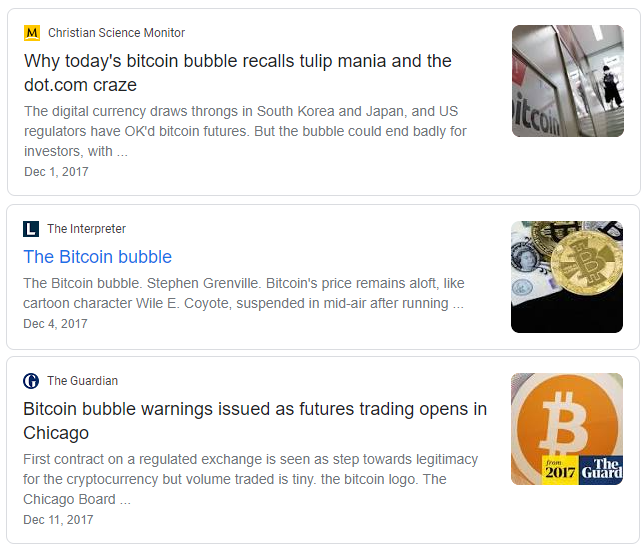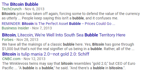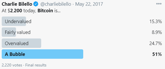 비트코인이 2,200달러에 거래되던 2017년의 여론조사에서는 응답자의 절반 이상이 거품이라고 답했다.
